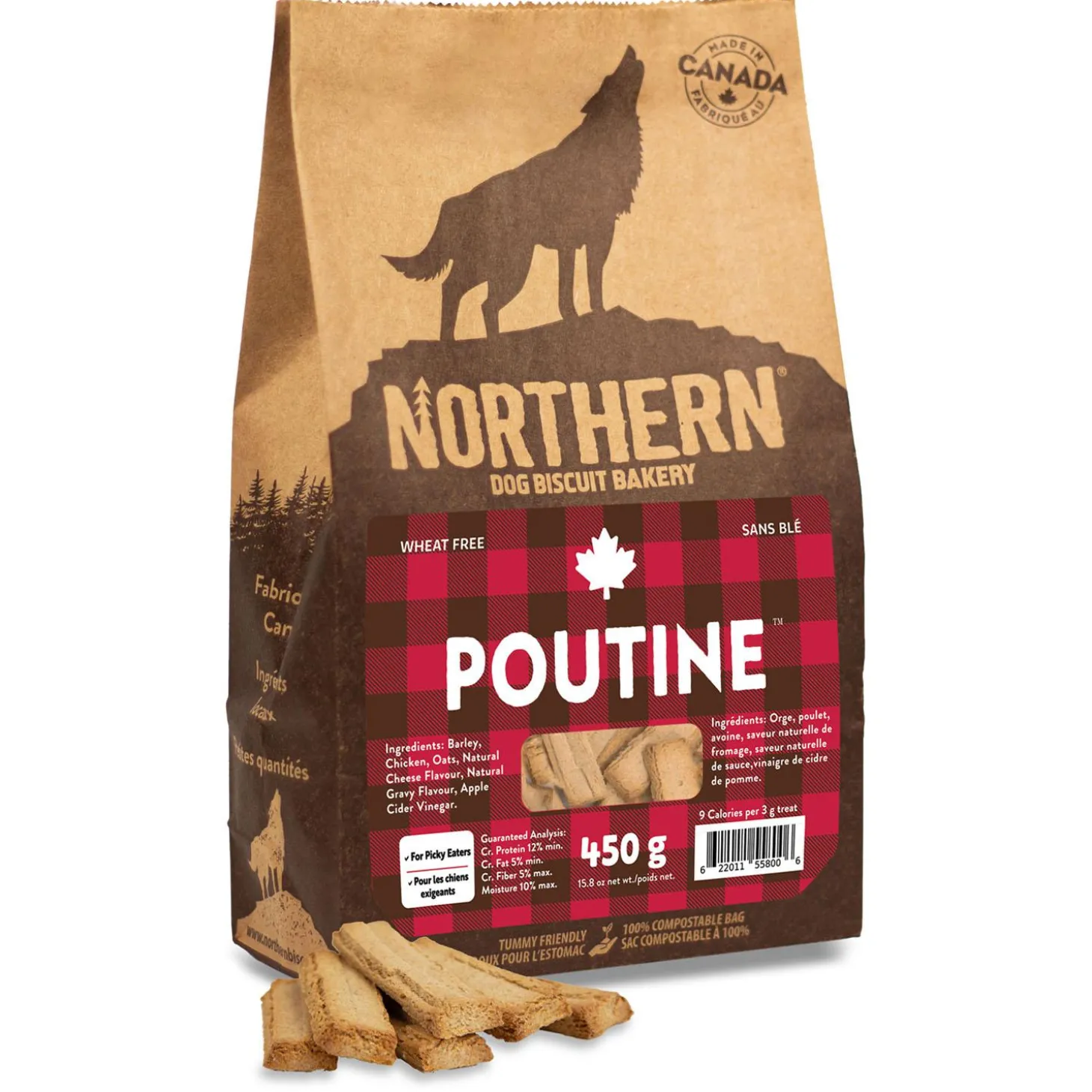 Northern Biscuit Poutine dog treats are a play on the greatest Canadian delicacy of all time, and are even shaped like fries! These tasty tributes to our homeland are baked with fresh, food-grade chicken blended with standard poutine favourites of course; natural flavours of gravy and cheese. Baked in small batches with limited ingredients and the specially crafted Northern CRUNCH, these biscuits are naturally preserved and packaged in a 100% compostable bag. At only 9 calories per 3g biscuit, these biscuits are perfect for treating, rewarding and bonding with your dog.