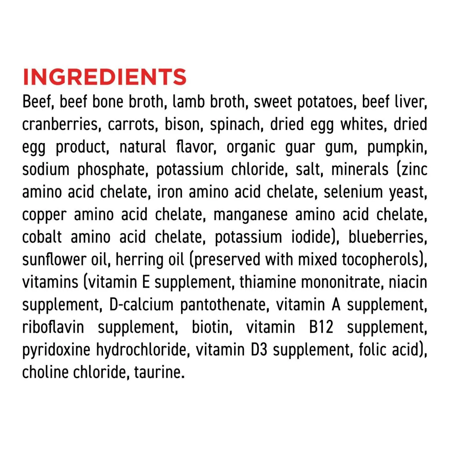 - The first 3 ingredients are fresh or raw beef, beef bone broth and lamb broth. These fresh ingredients use refrigeration as the sole method of preservation and the raw ingredients are frozen at their peak freshness.