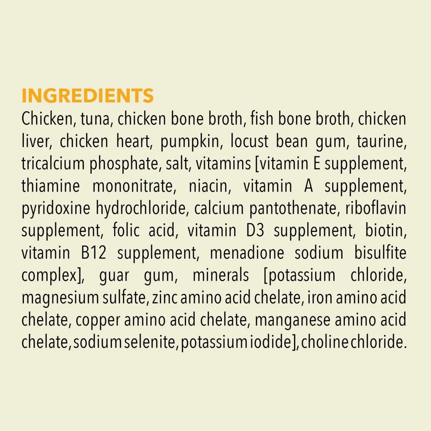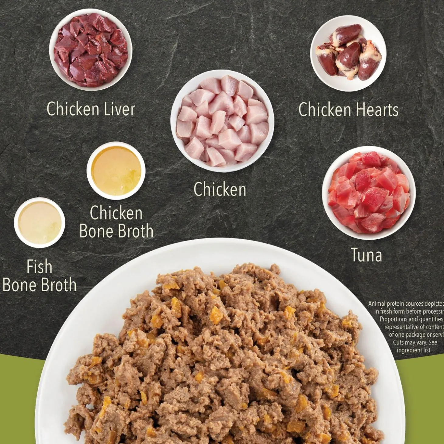 - The first 6 ingredients are raw chicken, tuna, chicken bone broth, fish bone broth, chicken liver and chicken heart.