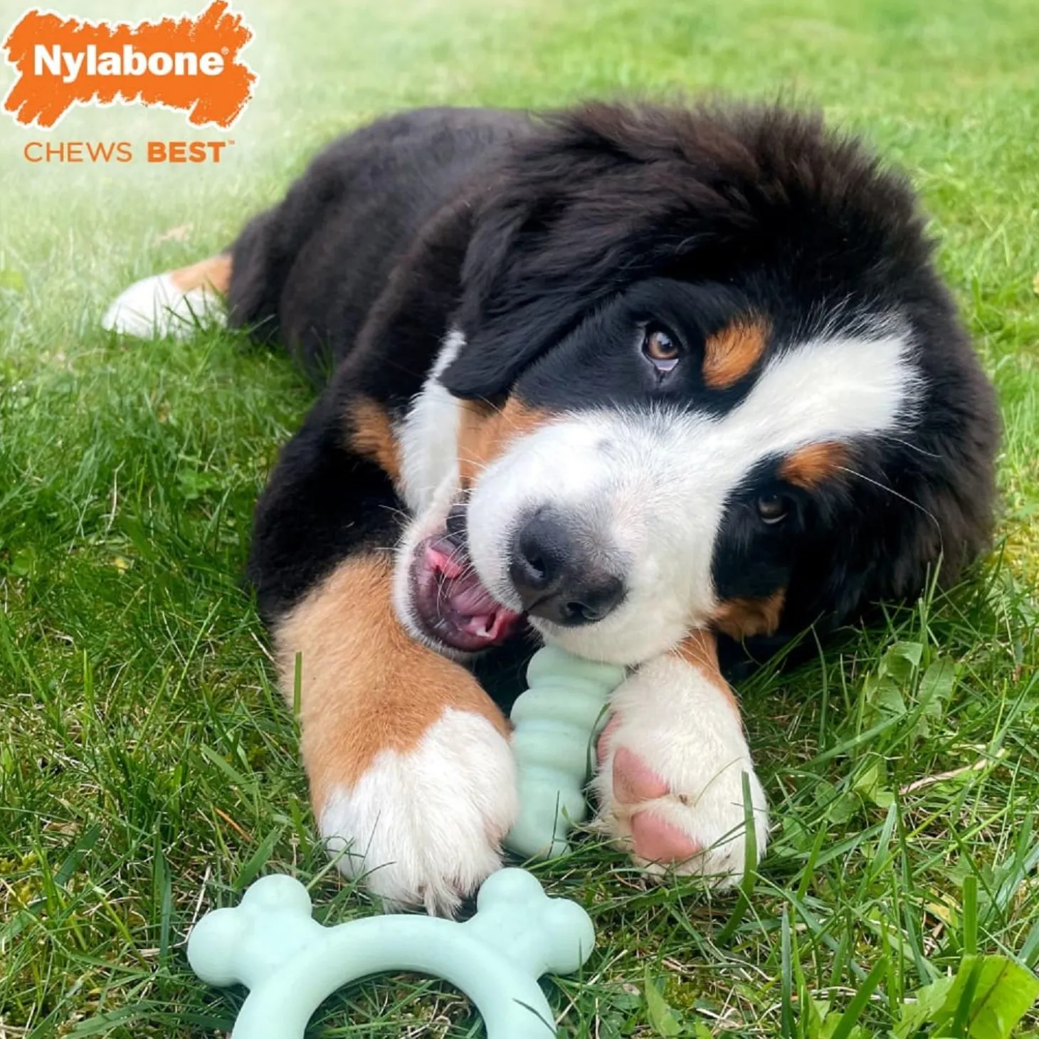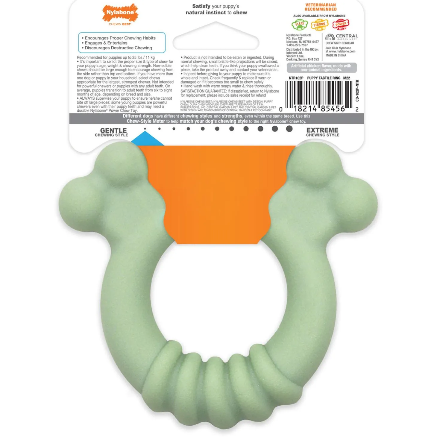 Nylabone Puppy Chew Chicken Flavour Teething Tactile Ring Dog Toy gives your pup the teething relief they need! Made from a comforting sensory material, this teething ring is gentle on puppy gums and can be frozen for an extra-soothing feel. Plus, it is uniquely designed with bone ends that are perfect for reaching back teeth. This chew toy also features delicious chicken flavour that will keep your pup coming back for more fun. Teach your best friend positive chewing habits that will last a lifetime with this puppy chew toy!