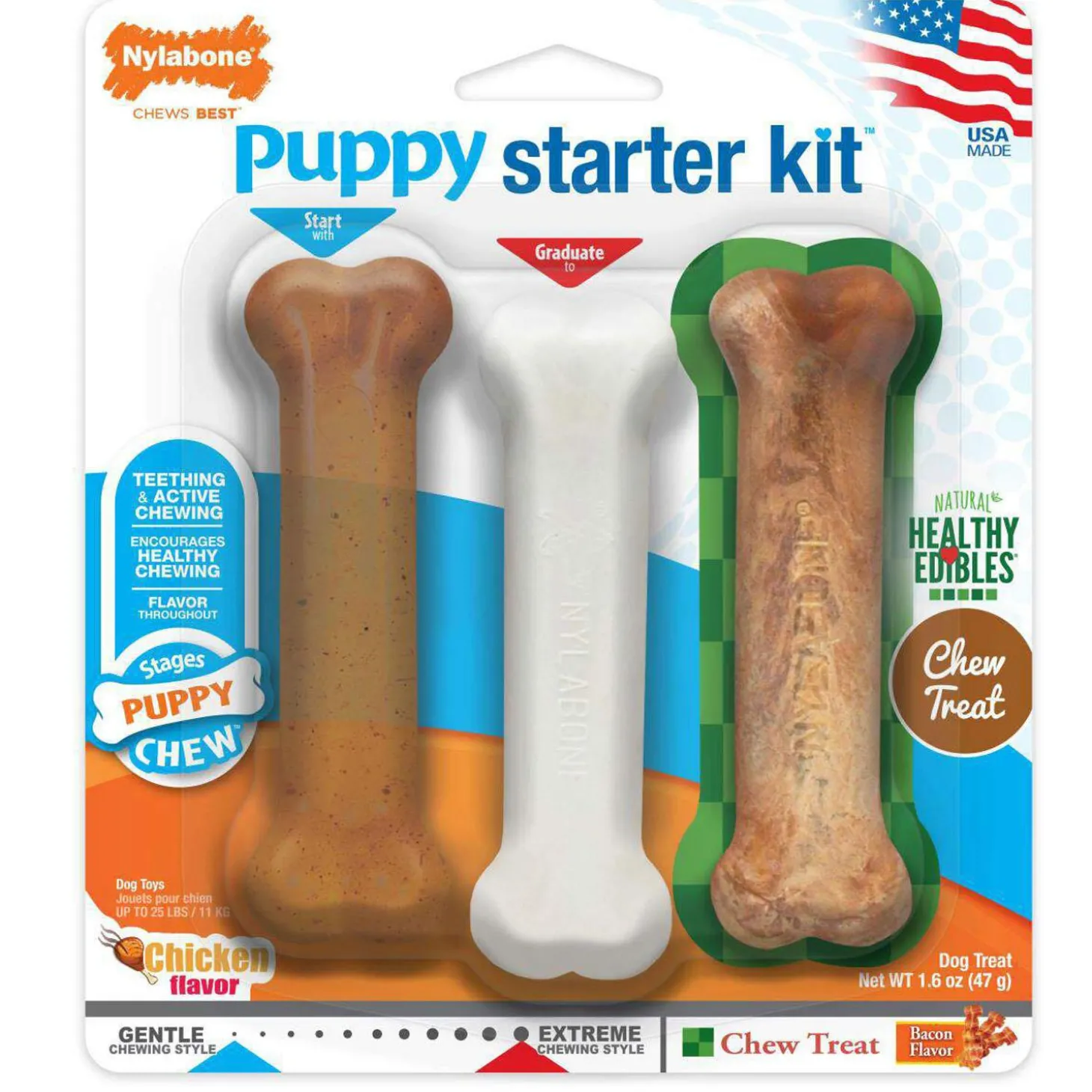 Nylabone Puppy Starter Kit Dog Chew Toys help develop healthy chewing habits from the start. This kit includes a soft plastic Puppy Chew Bone for teething puppies before they get any permanent teeth, a Power Chew chicken-flavoured bone for puppies starting to get their permanent teeth and a Healthy Edibles bacon-flavoured chew treat recommended for puppies 6 months and older. Each chew encourages proper chewing habits and helps discourage destructive chewing from a young age. Plus, they promote dental health by reducing plaque and tartar as your dog chews. You can feel good about rewarding your new best fur friend with these veterinarian- recommended puppy chew toys that are proudly made in the USA!