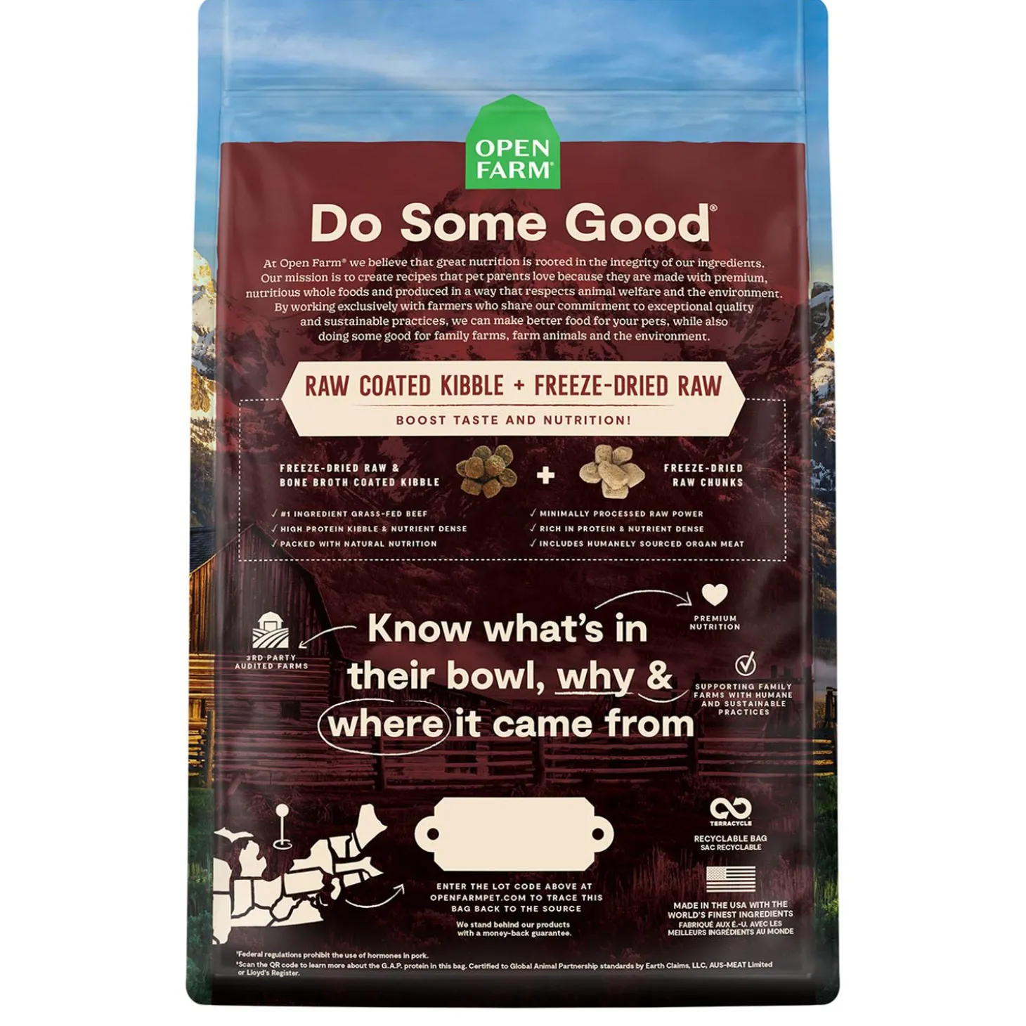 Open Farm RawMix Front Range Recipe Ancient Grains Dog Food features protein-packed kibble covered in a nutritious bone broth and freeze dried raw coating, with added chunks of pork & beef freeze dried raw. Crafted with a blend of 100% animal welfare certified grass-fed beef, pasture-raised lamb and pork, this irresistible recipe includes nutrient-dense meat, organ, and bone with non-GMO grains, fruits, and veggies.