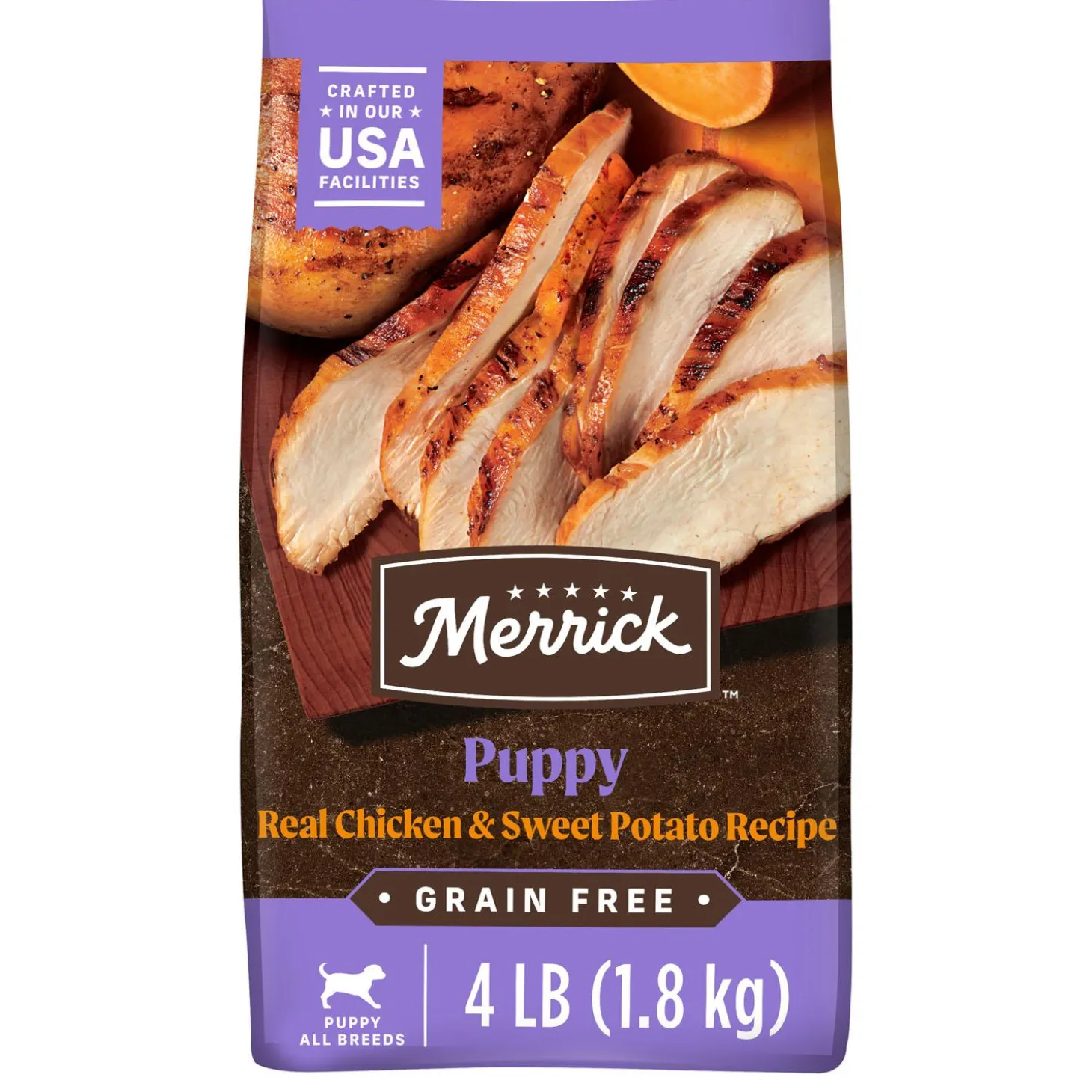 - Merrick puppy food delivers 67% of protein from animal sources, providing high protein levels for developing muscles. This recipe contains DHA to support brain development.