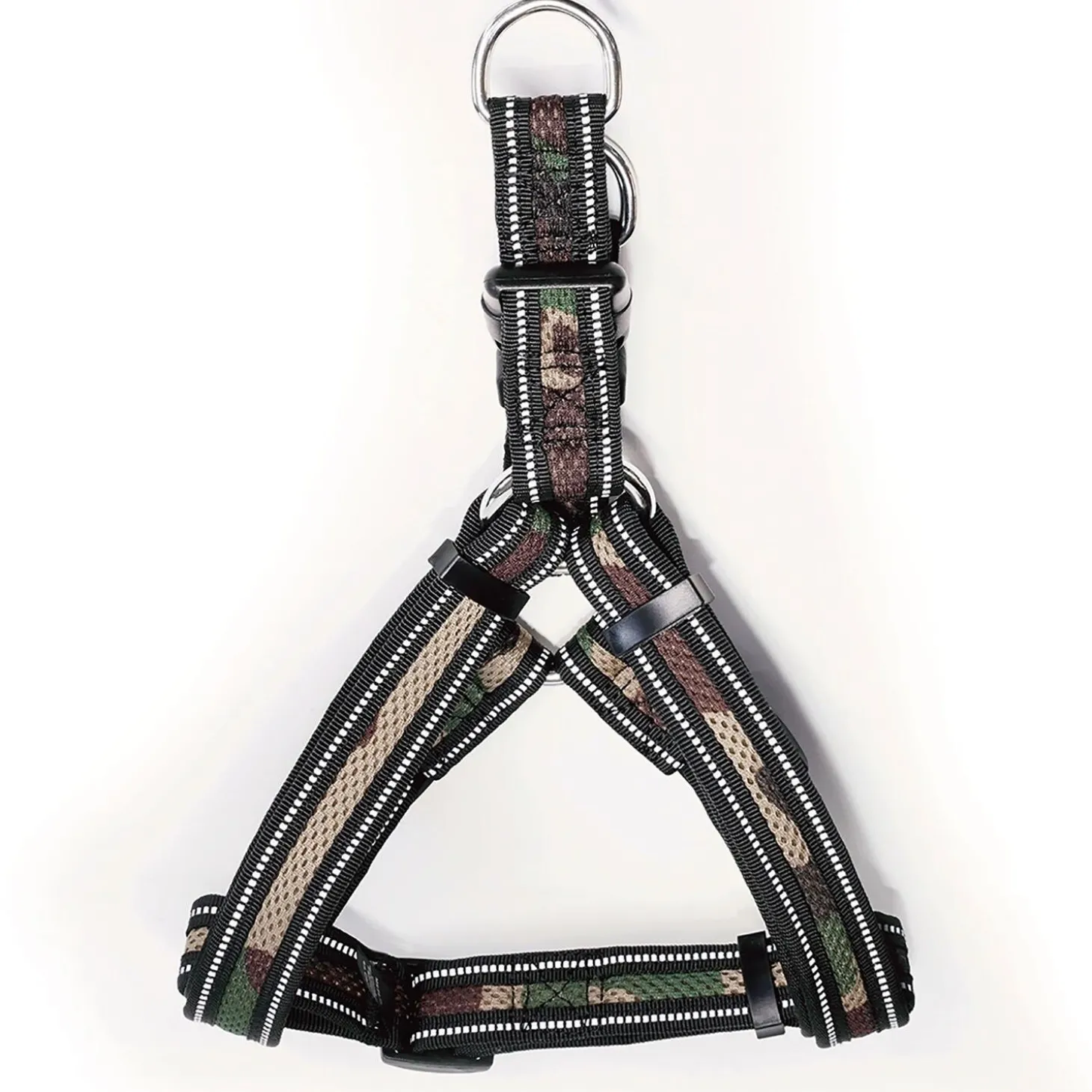 JUMP! Reflective Air Mesh Step-In Camo Dog Harness is lightweight for added comfort and reduced risk of skin irritation, and easy to put on. Simply have your dog step into each loop and secure at the back with buckle and adjust for perfect fit, leaving two-finger space between dog and harness. D-rings for leash attachment can also be found at the back with the buckle. Step-In harnesses distribute pressure more evenly across the check and front legs thus reducing pressure on a dog’s neck. The air mesh provides comfort and breathability for increased airflow to keep dogs cooler in hot weather and reflective stitching provides for better visibility in low light. Not suitable for use with a tie-out.