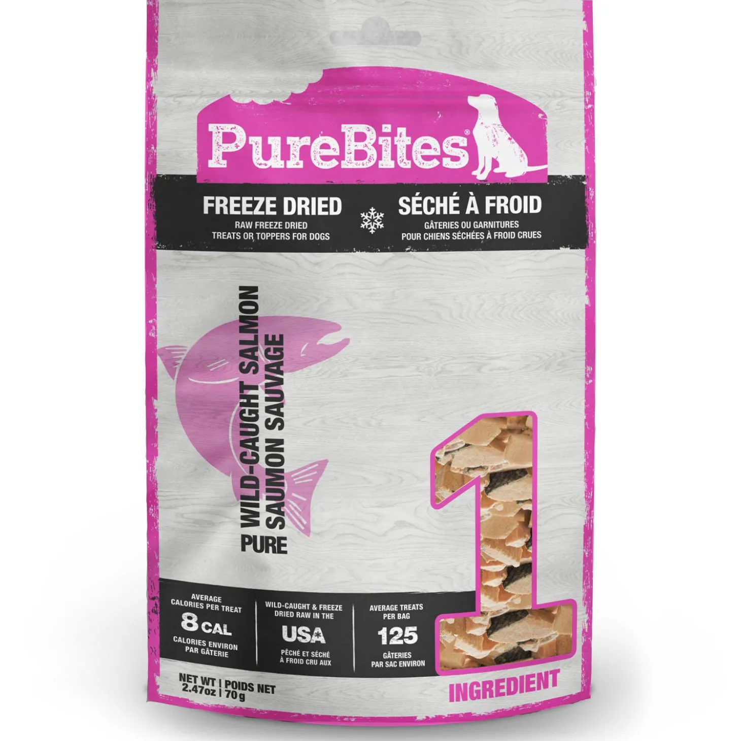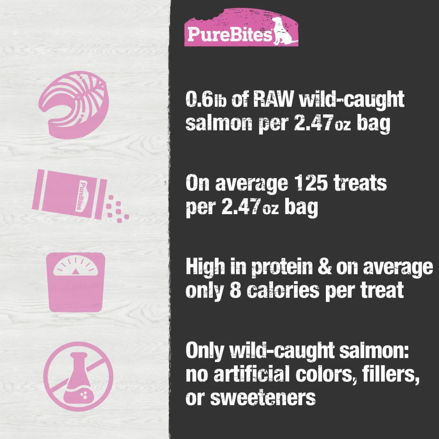 - Dogs love the taste of PureBites! 100% natural, high in protein, low in calories (only 8 calories per average treat) and nothing added like colours, fillers, or sweeteners; salmon & salmon skin are rich in nutrients to support skin & coat health