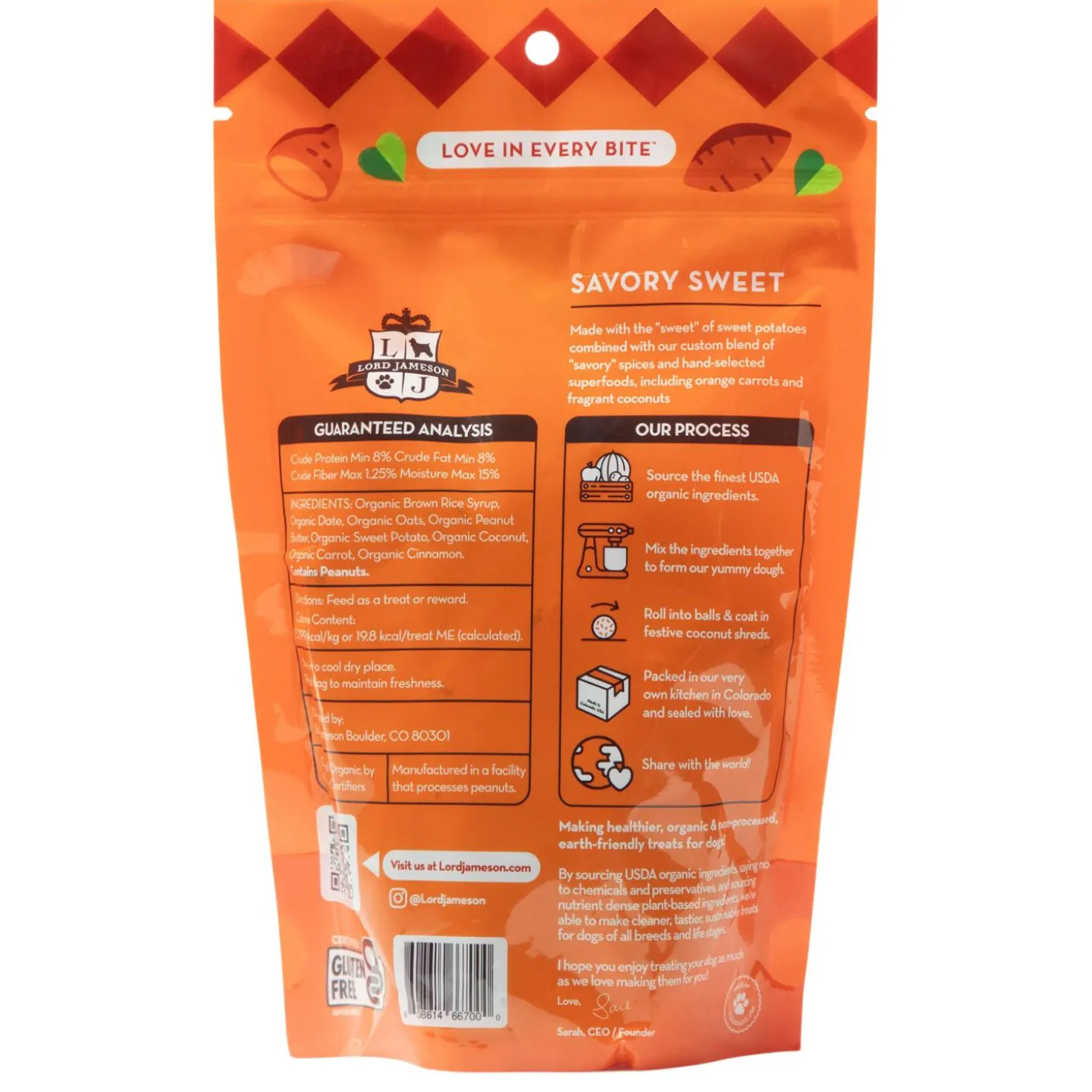 Lord Jameson Savoury Sweet is made with the sweetest of sweet potatoes combined with a custom blend of savoury spices and hand-selected superfoods, including orange carrots and fragrant coconuts. Feel confident in feeding these organic treats to your furry friend.