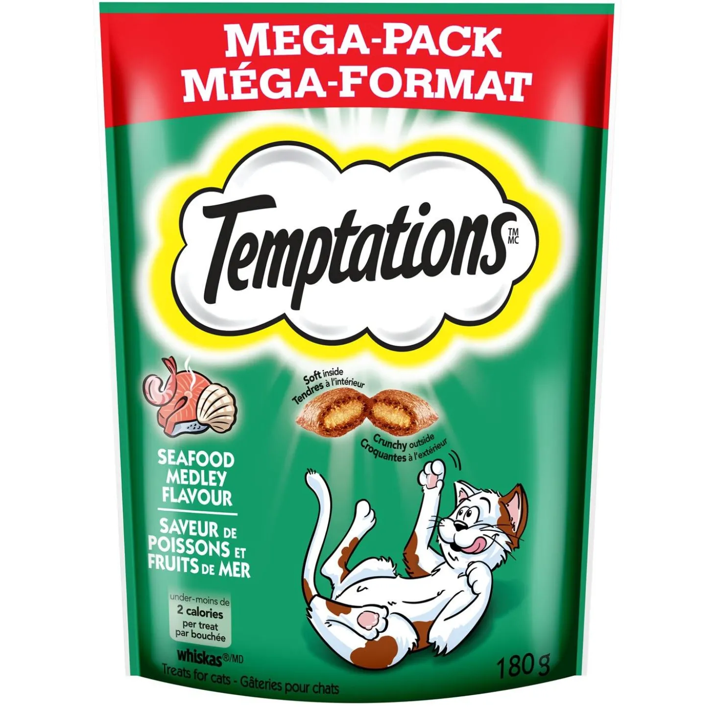 Temptations Seafood Medley Flavour Cat Treats have less than 2 calories per treat and provide an irresistible combination of both crunchy and soft textures. These cat treats are a perfect addition to your cat’s normal feeding routine. Cats can’t resist the delectable taste of Temptations, so give your cat these purrfect cat treats… they’ll come running the moment you open the pack!