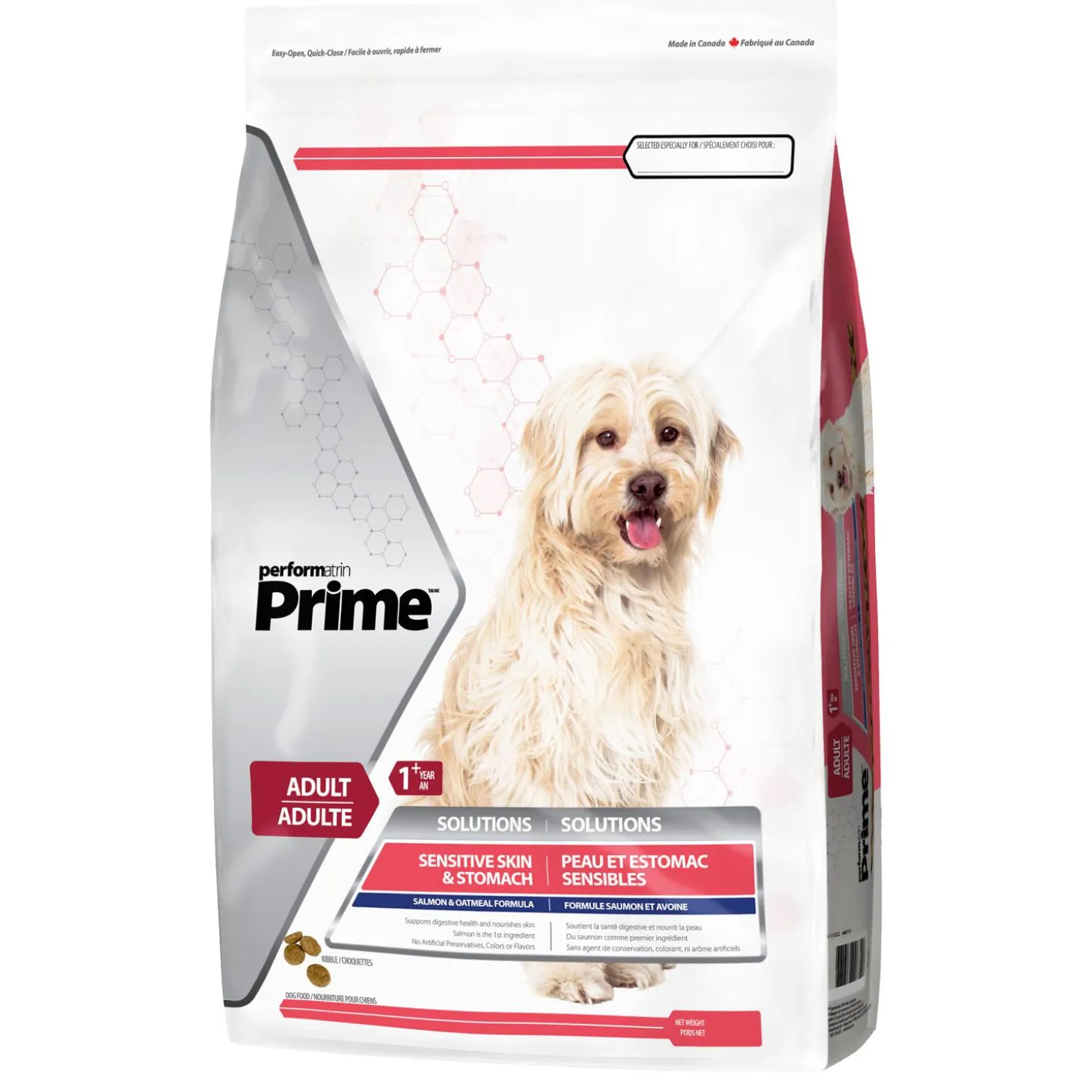 Performatrin Prime Sensitive Skin & Stomach Salmon & Oatmeal Formula Adult Dog Food is formulated to nourish your dog’s skin for a healthy coat and support digestive health, while still meeting their specific daily energy and nutrient requirements. The Omega Fatty Acids found in salmon as well as Vitamin E help nourish your dog’s skin and support a healthy coat. Gamma-Linolenic acid locks in moisture to keep skin and coat hydrated. Increased levels of Zinc support growth & repair of skin cells. The naturally occurring prebiotic fibres found in oatmeal and chicory root support a balanced microbiome for dogs with sensitive stomachs.