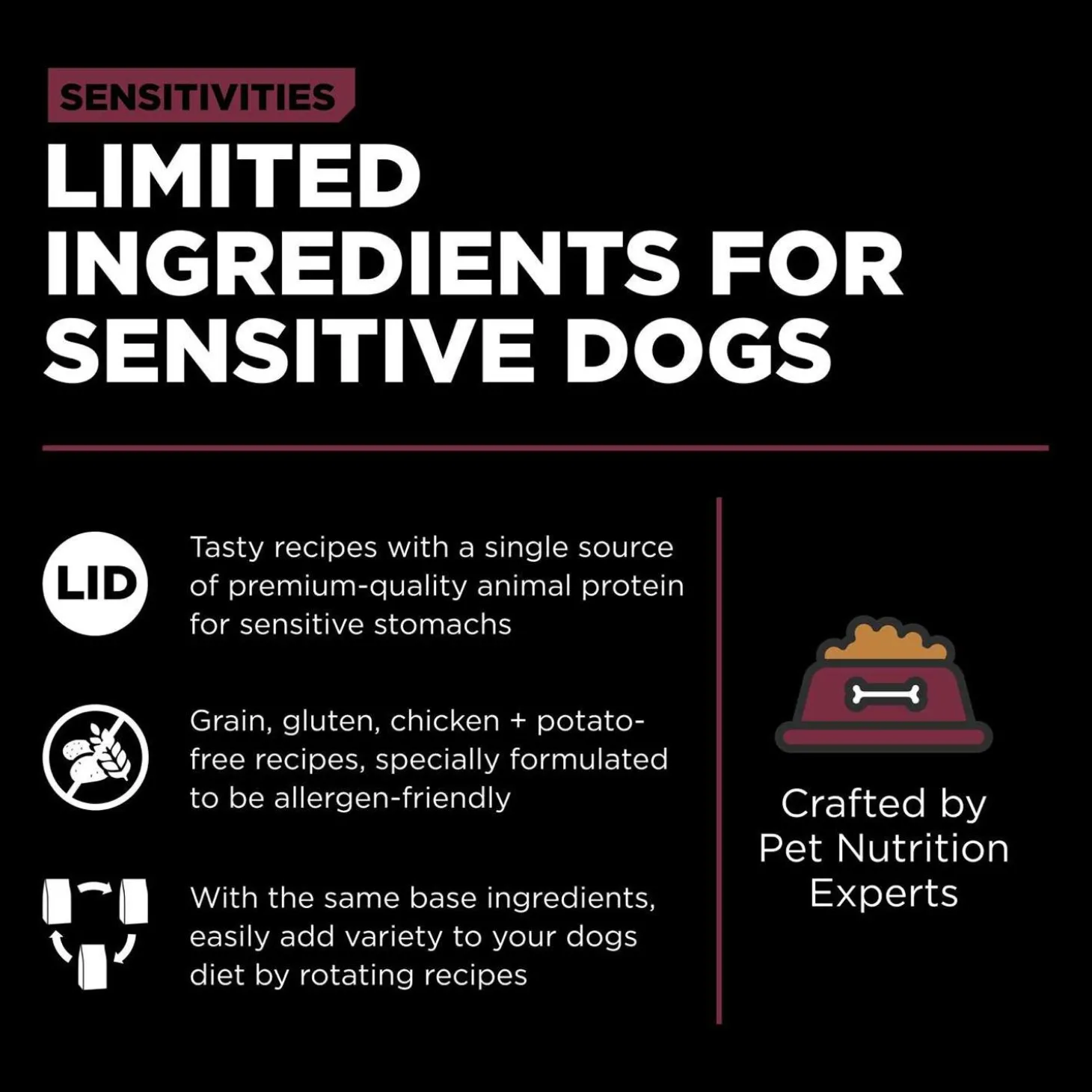 - Complete + balanced nutrition for dogs: With as few ingredients as possible to limit your dog’s exposure to foods they may be allergic or sensitive to, with no chicken, wheat, corn, or soy.