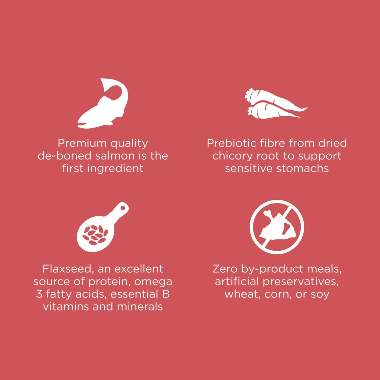 - Made with natural ingredients: premium-quality salmon for protein and prebiotic fibre from dried chicory root to support sensitive stomachs.