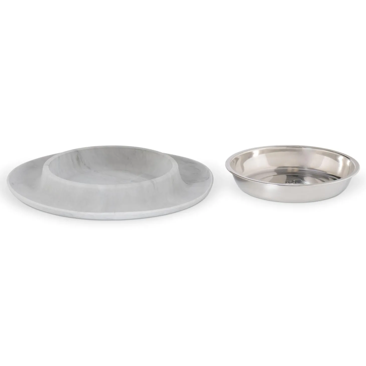 Messy Cats Silicone Marble Feeder with Stainless Saucer Shaped Bowl is designed to make sure you can feed your cat and not your floor. The non-slip silicone base prevents damage to your floors and holds the stainless steel bowl in place for your cat. Contain any further messes with the wide lip and raised edge border. The saucer shaped stainless dish is wide with low side to help reduce whisker fatigue and irritation while eating or drinking. The ‘marble look’ silicone base provides grip to keep the bowl in place as well as a raised edge to help contain the spills. ideal for advanced food prep, travel and preservation.