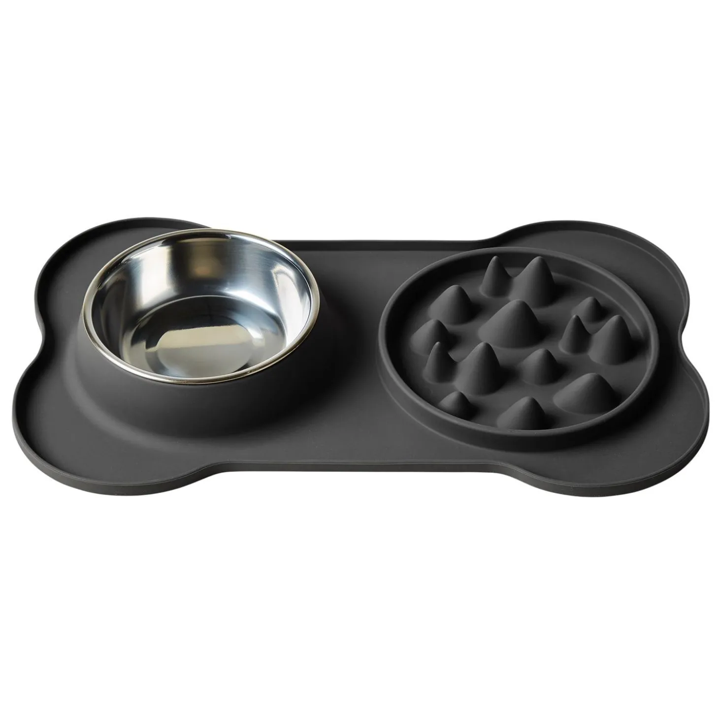 The Essentials Slow Feeder’s was purposely designed to slow down your dog during mealtime, encouraging better digestion. The raised edges in the feeding bowl creates obstales, while the non-slip base and bone-shaped mat help limit spillage.