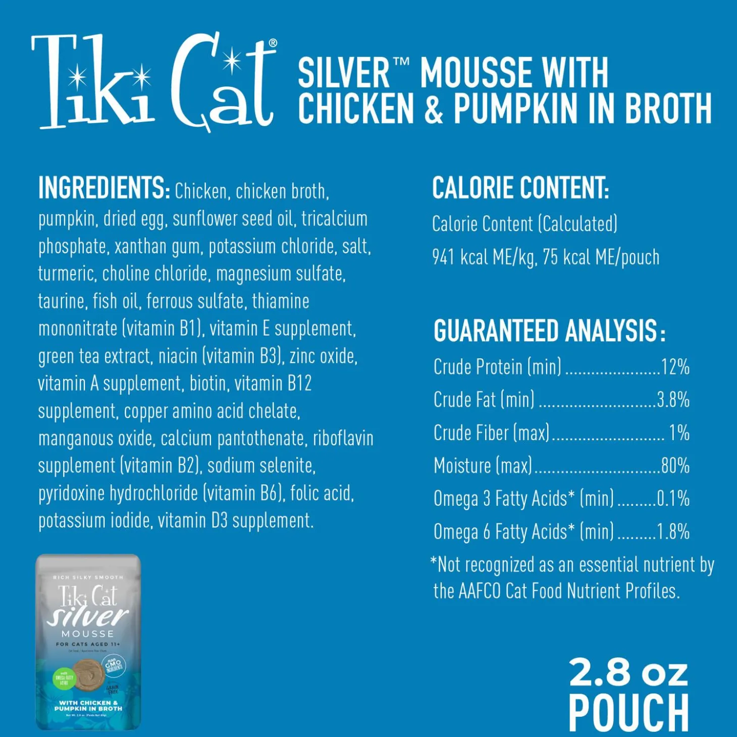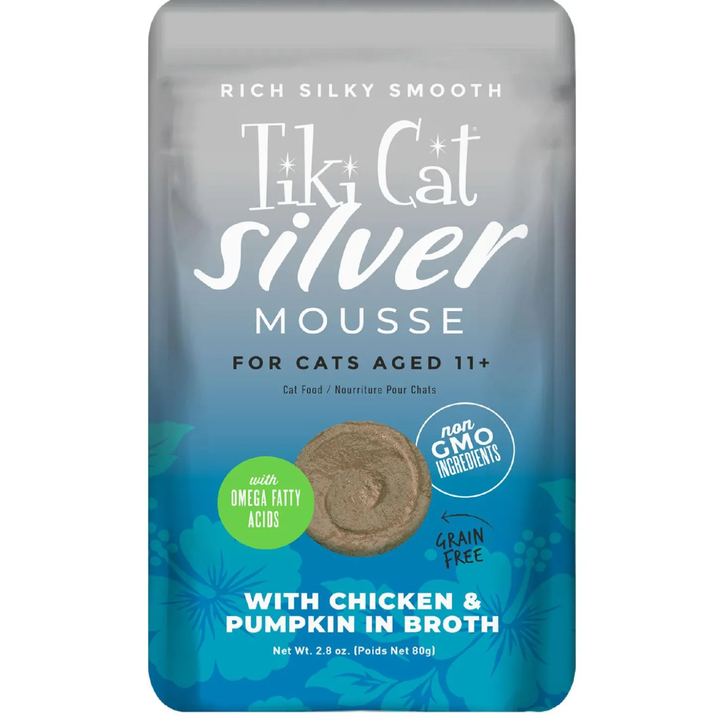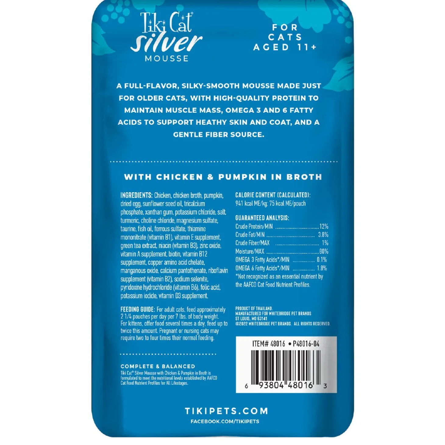 Tiki Cat Silver Mousse Chicken & Pumpkin in Broth Senior Cat Food is a full-flavour, silky-smooth mousse made just for older cats. Made with high-quality protein to maintain muscle mass, antioxidant nutrients to support healthy immune systems and a gentle fibre source to improve digestion.