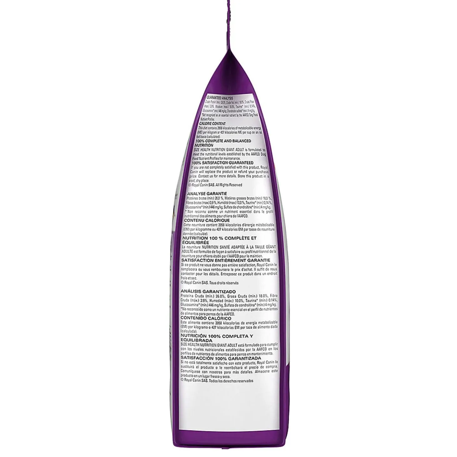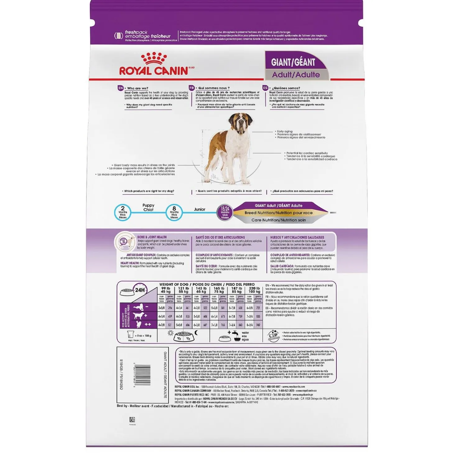 Royal Canin Size Health Nutrition Giant Breed Adult Dog Food will serve up the tailored nutrition your big dog deserves. Royal Canin makes it easier than ever to feed your big dog dry food. This extra-large dog food formula features a crunchy dog kibble texture your extra-large dog will love. Not only that, but this complete and balanced adult dry dog food provides the nutrition to help your best friend thrive. Glucosamine, chondroitin, and EPA/DHA in this extra-large dog food help keep your big dog’s bones and joints healthy and strong, while an exclusive complex of antioxidants supports cellular health. Nutrients like taurine help keep big hearts healthy, and high-quality proteins and fibers support digestive health. Giant dogs deserve an extra-large helping of nutrition. Promote your dog’s overall wellness with every Royal Canin Giant Adult Dog Food serving.