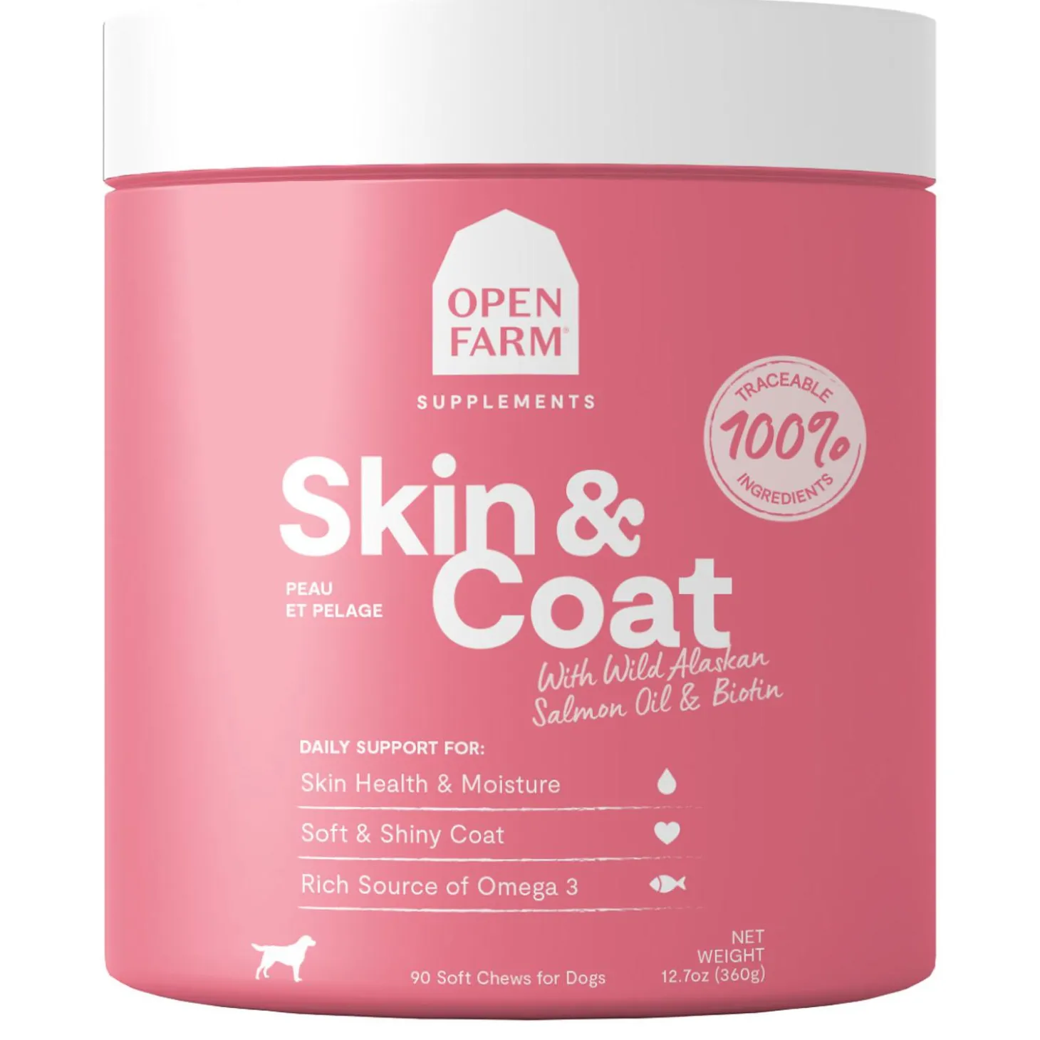 Open Farm Skin & Coat Dog Supplements are formulated to help support and promote a soft and shiny coat. They contain 100% traceable and vet-recommended functional ingredients.
