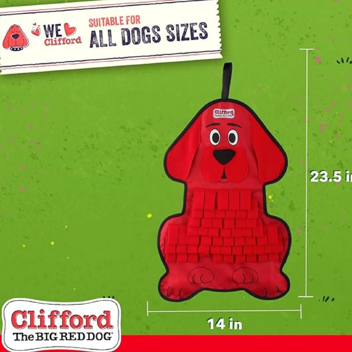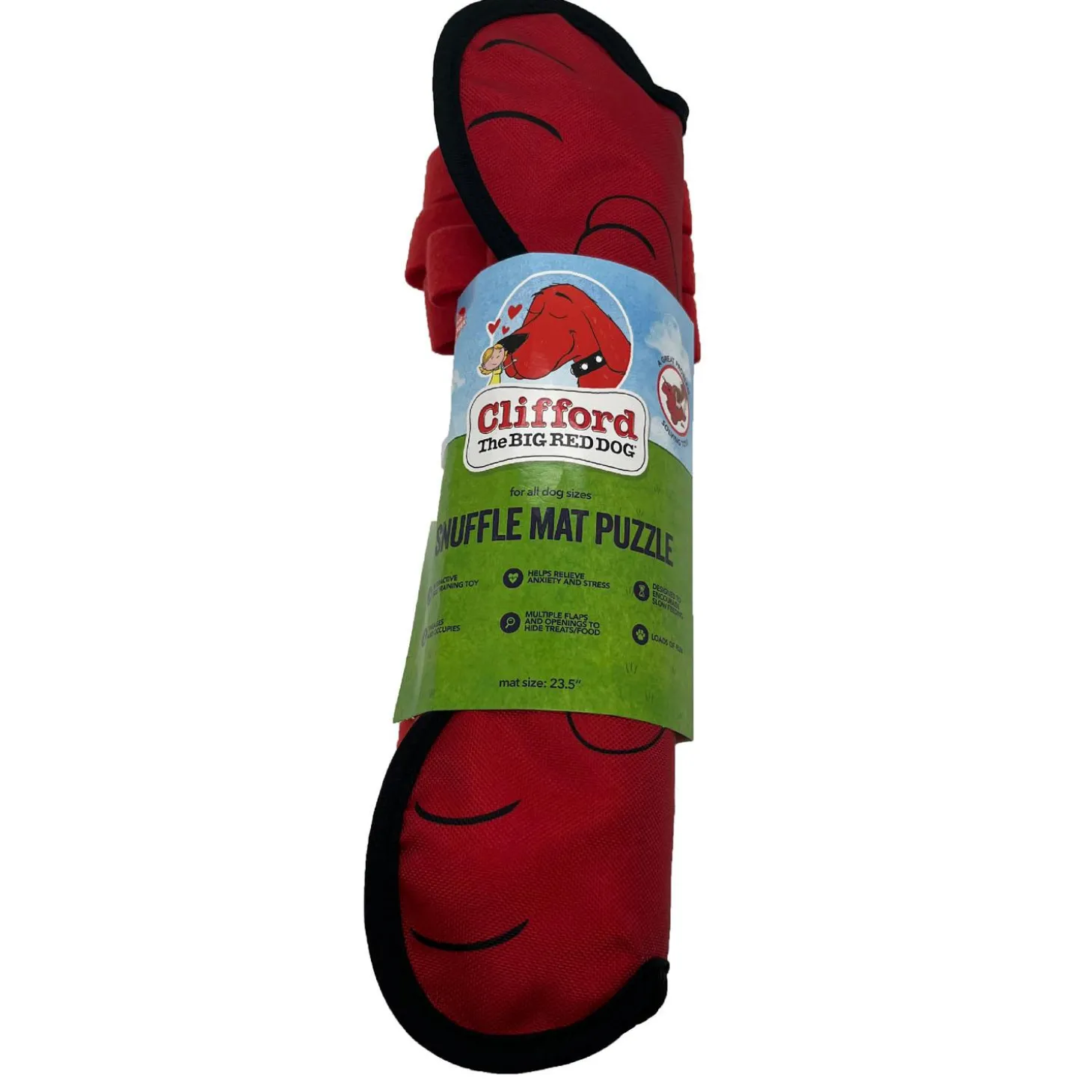 Clifford Snuffle Mat Puzzle Dog Toy is an interactive dog training mat and snuffle treat mat puzzle with squeaky toes. Designed to encourage slow feeding, multiple flaps and openings to hide and seek treats & food with loads of fun. For all dog sizes.