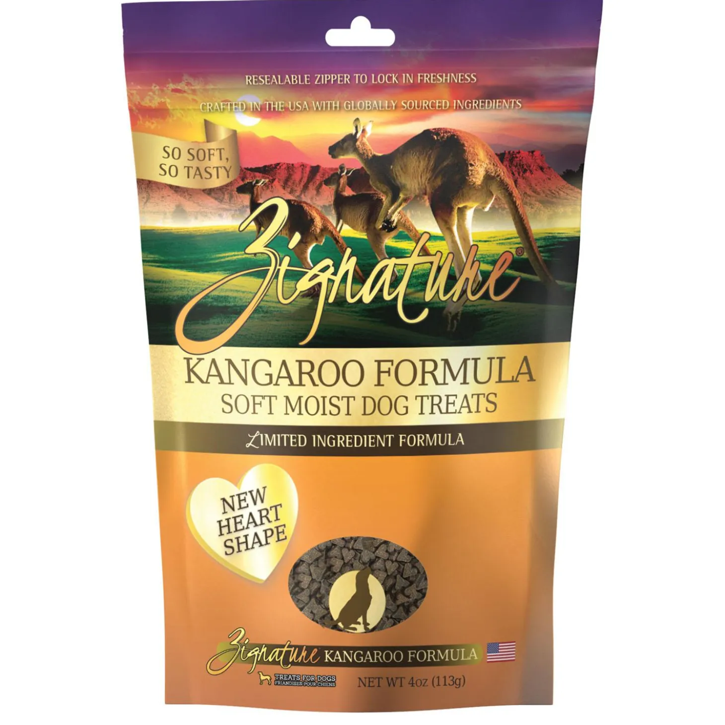 Zignature Soft Moist Kangaroo Formula Dog Treats are formulated with the same limited ingredient philosophy as the dry and canned foods. Delivering a high-quality, delicious treat for your canine companion. By excluding ingredients your dogs do not need, Zignature is able to bring you a treat that is simple yet so tasty. To bring out the best in dogs, Zignature is committed to providing animal or fish protein as the first ingredient as protein is essential for a healthy diet. Zignature Soft Moist Dog Treats are made with animal or fish protein first, followed by a simple list of other wholesome ingredients.