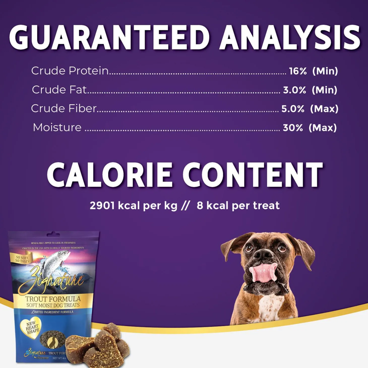 Zignature Soft Moist Trout Formula Dog Treats are formulated with the same limited ingredient philosophy as the dry and canned foods. Delivering a high-quality, delicious treat for your canine companion. By excluding ingredients your dogs do not need, Zignature is able to bring you a treat that is simple yet so tasty. To bring out the best in dogs, Zignature is committed to providing animal or fish protein as the first ingredient as protein is essential for a healthy diet. Zignature Soft Moist Dog Treats are made with animal or fish protein first, followed by a simple list of other wholesome ingredients.