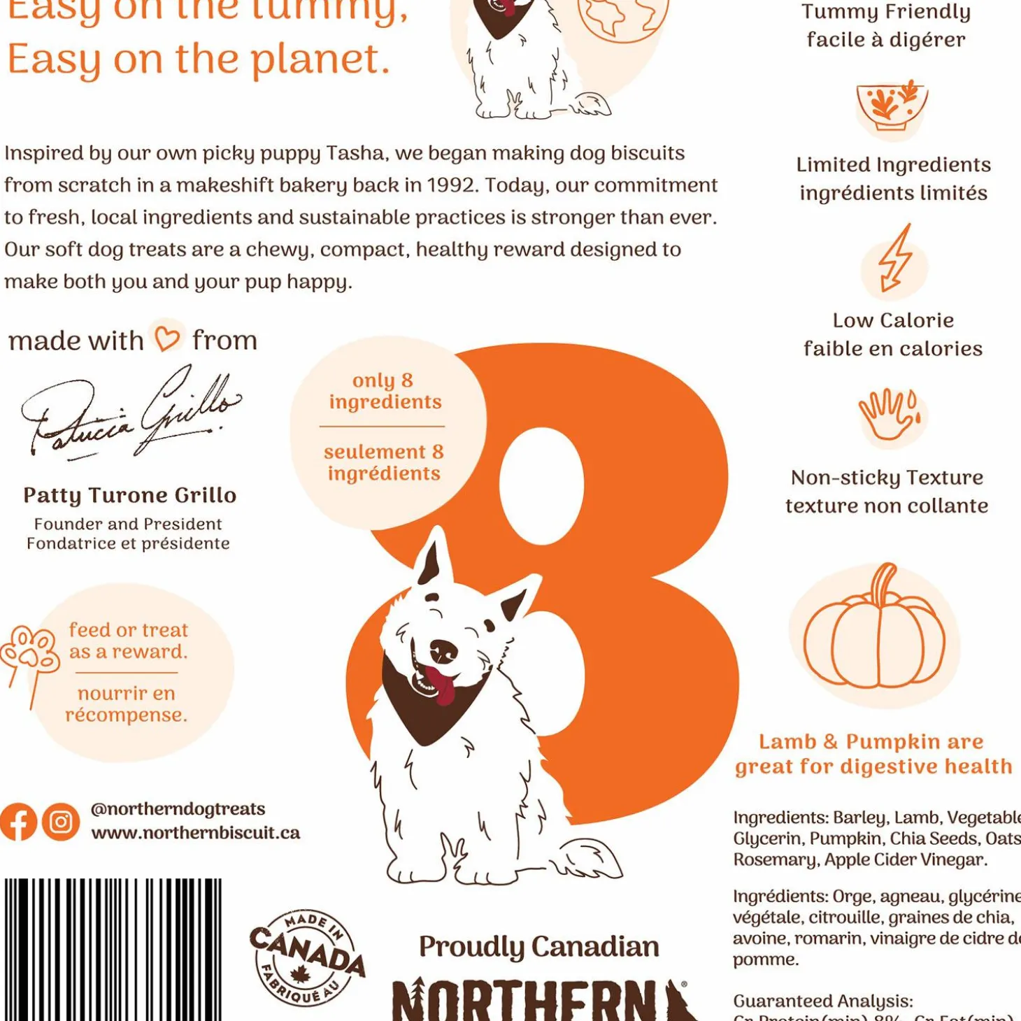 Northern Biscuit Softies Lamb & Pumpkin Dog Treats are soft & chewy and sure to be your pup’s new favourite high-value treat. Made with Fresh lamb and pumpkin, this recipe is hypoallergenic and great for dogs with sensitive tummies. These wheat-free dog treats are made with only 8 natural and locally sourced ingredients and have a non-sticky texture that makes them the perfect on-the-go reward for dogs of all ages. Packed with flavour and only 3 calories per treat, Northern Softies are ideal for frequent treating or training.