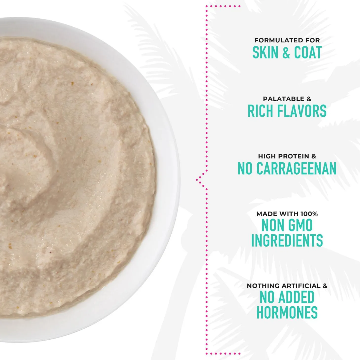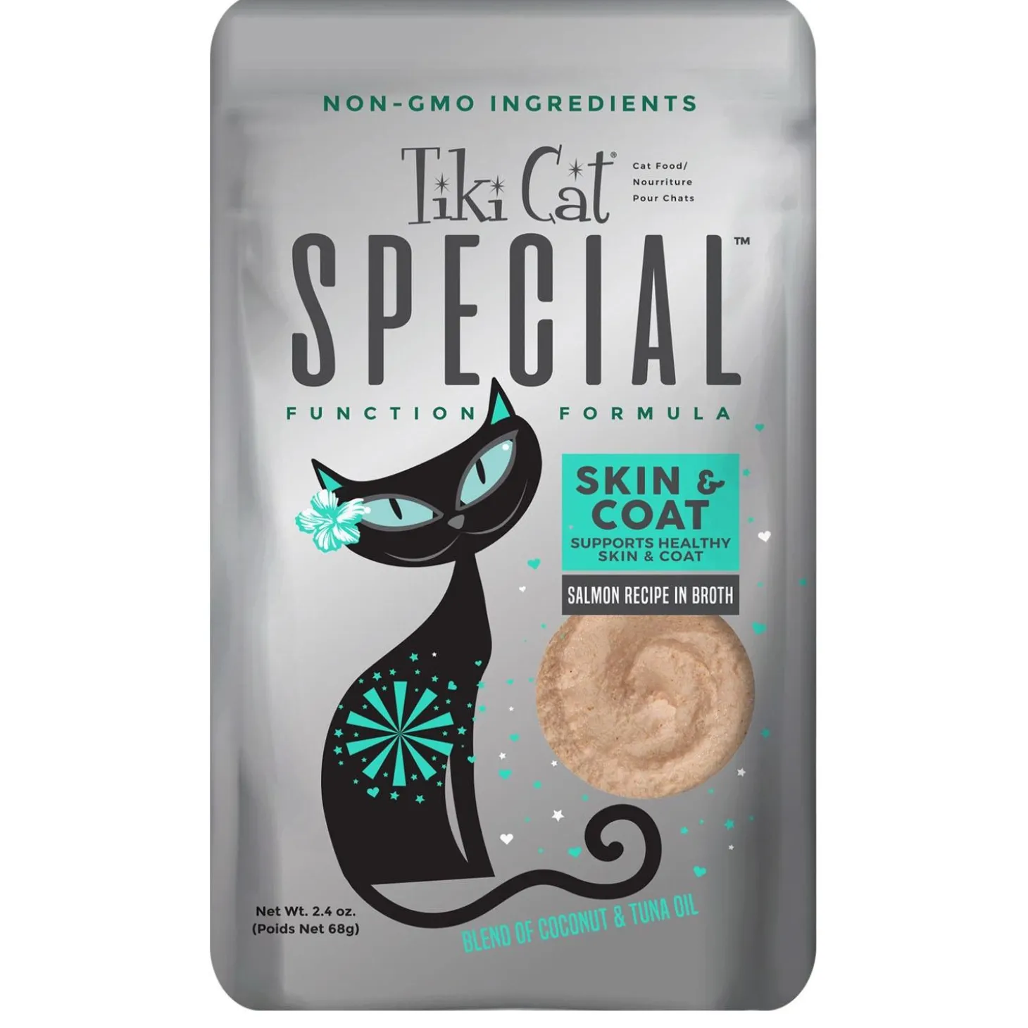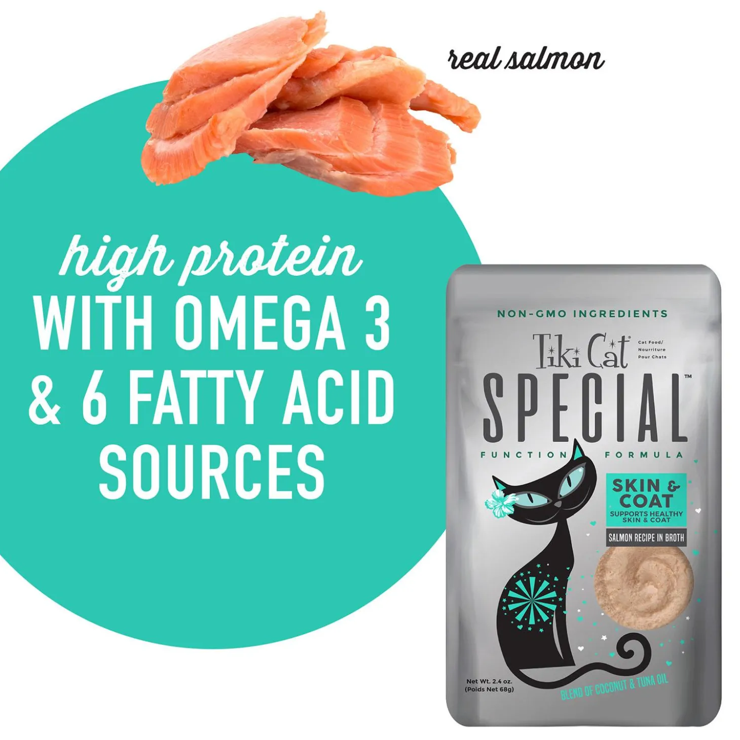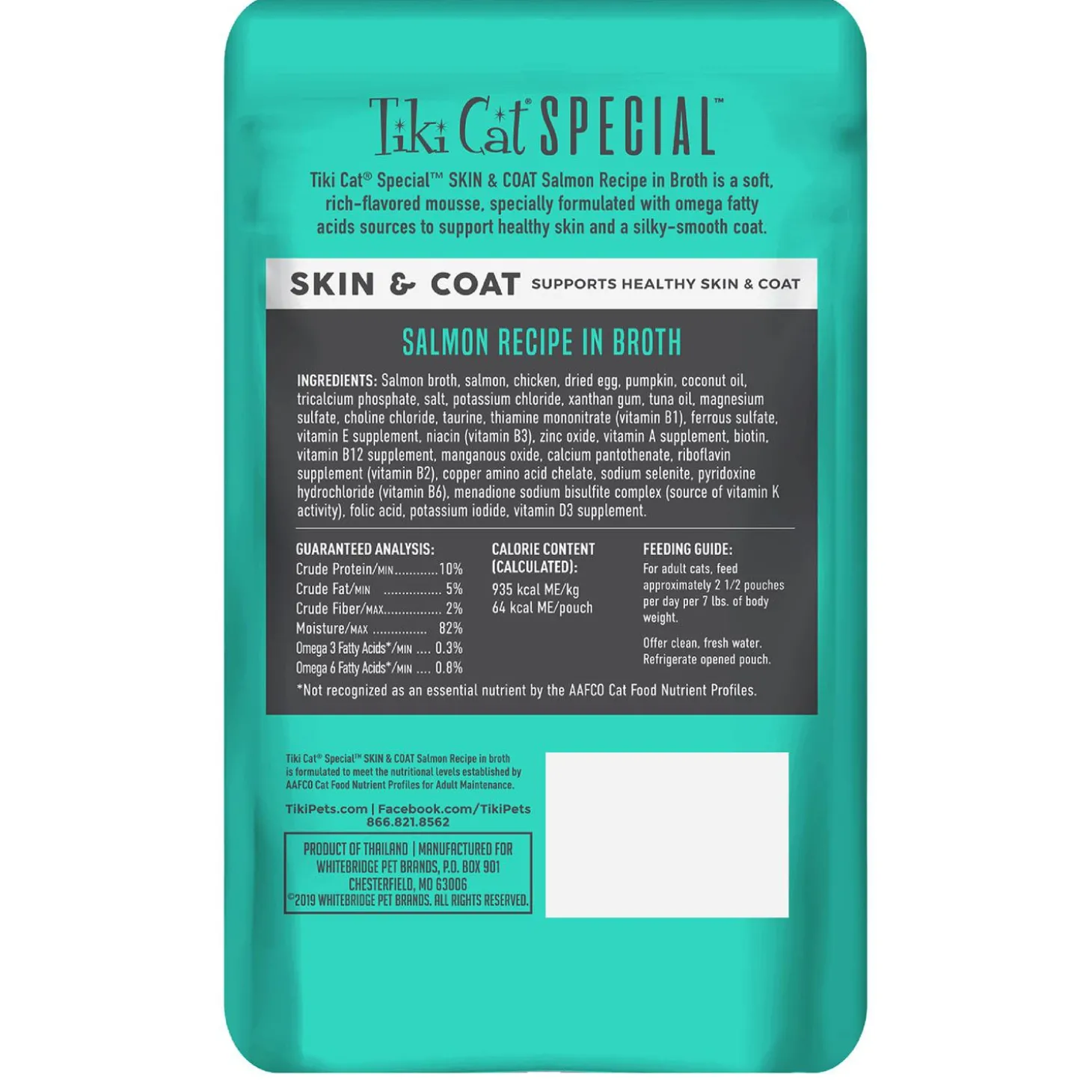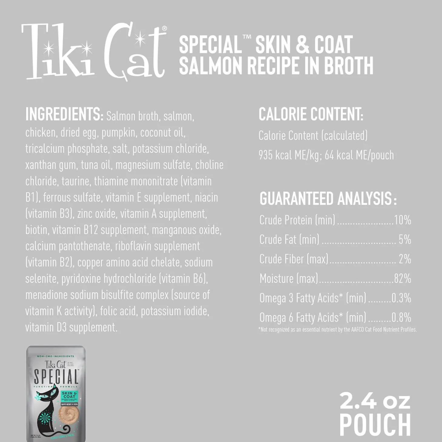 Tiki Cat Special Skin & Coat Salmon Recipe in Broth Cat Food is a soft, rich-flavoured mousse, specially formulated with omega fatty acids to support healthy skin and a silky-smooth coat. It’s made with 100% non-GMO ingredients including a blend of Coconut and Tuna oils.