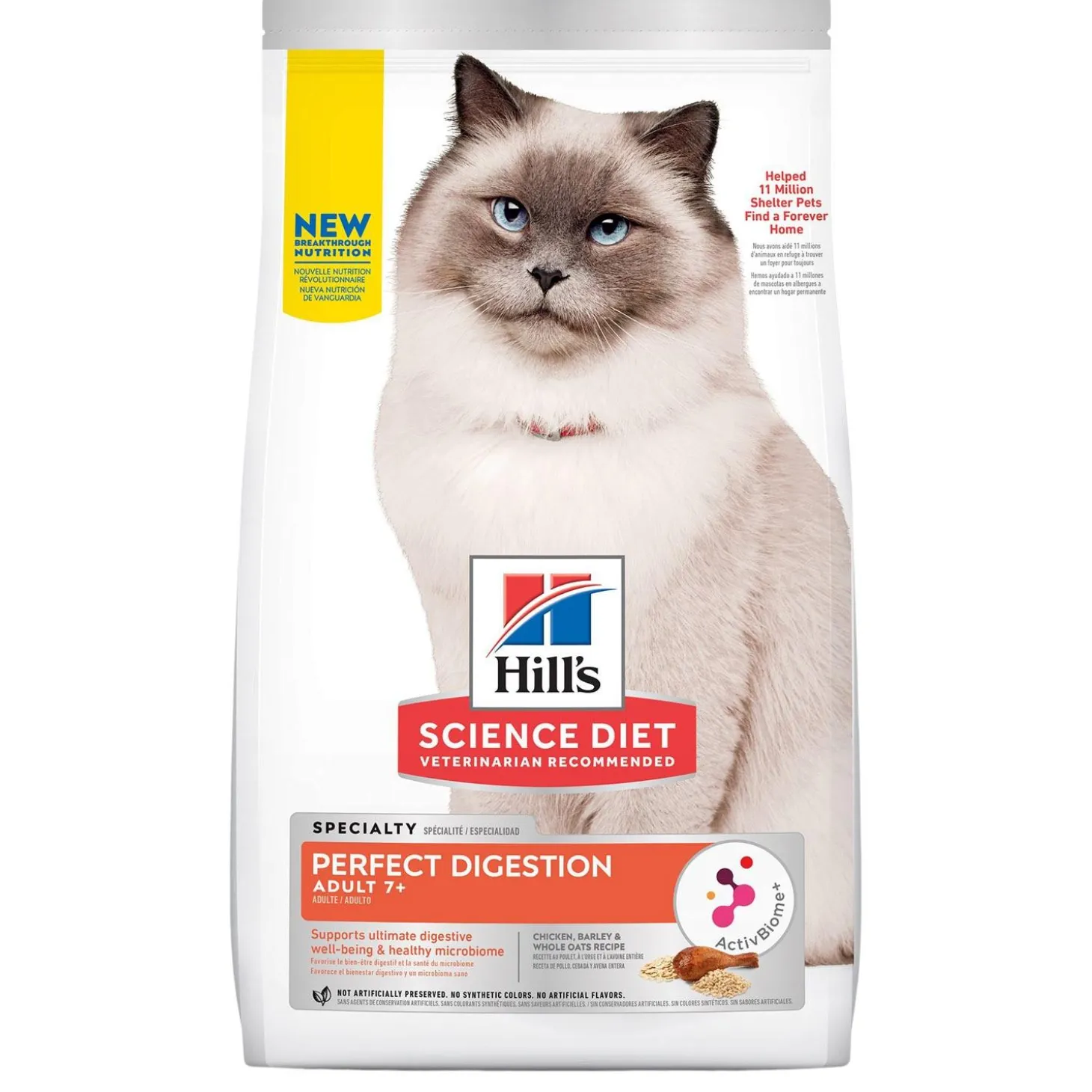 Hill’s Science Diet Specialty Perfect Digestion Chicken, Barley & Whole Oats Recipe Adult 7+ Cat Food is crafted with the digestive and overall well-being of cat’s aged 7+ in mind. It is a healthy, nutritious, and delicious option for feeding time. The exclusive ActivBiome+ Technology works to rapidly activate your pet’s unique gut microbiome for ultimate digestive health and well-being. The chicken, barley and whole oats recipe has plenty in the way of vitamins and antioxidants, while excluding any synthetic colours, and artificial flavours and preservatives.