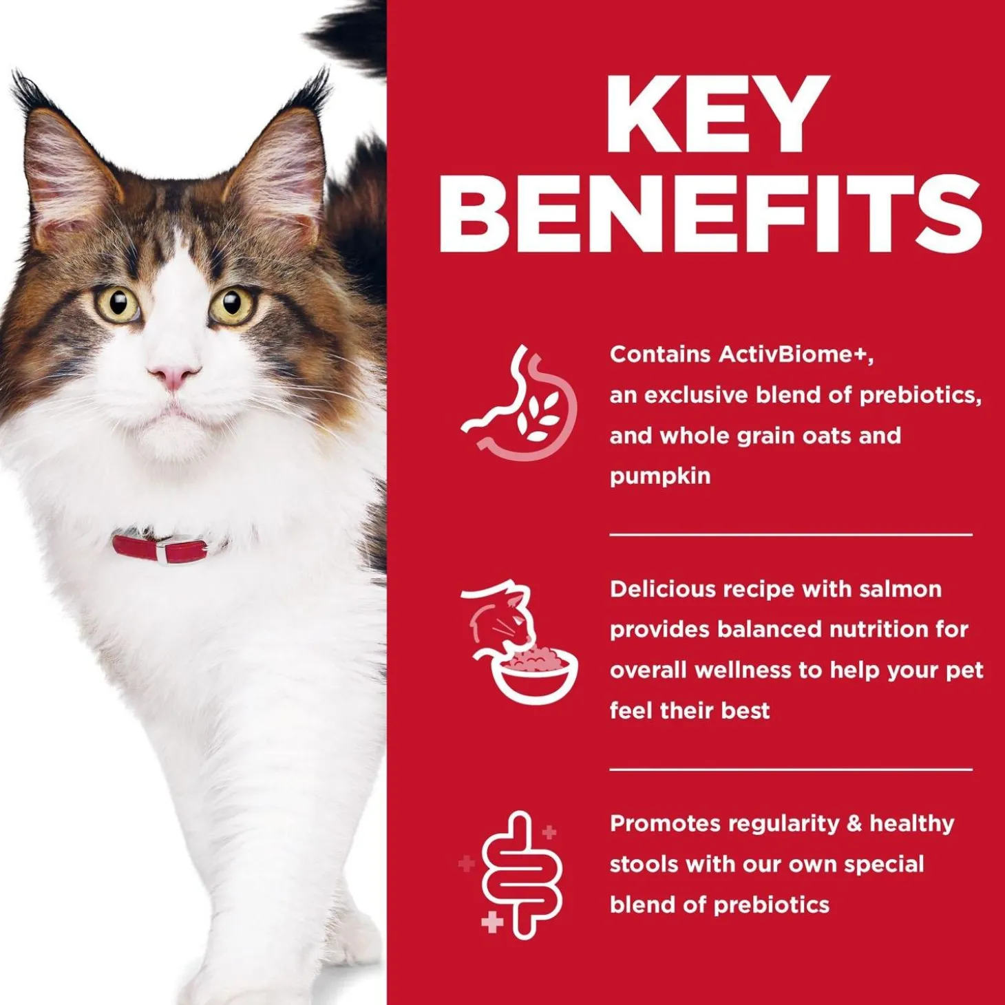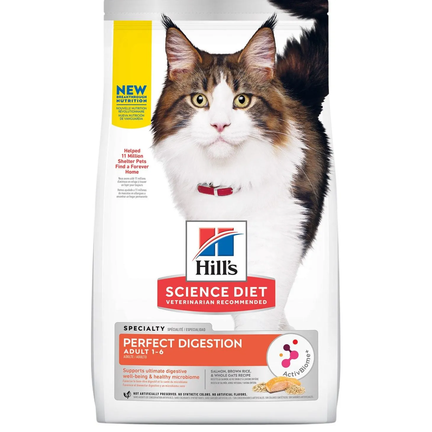 Hill’s Science Diet Specialty Perfect Digestion Salmon, Brown Rice & Whole Oats Recipe Adult Cat Food is a breakthrough nutrition that supports each cat’s unique gut microbiome for healthy digestion and balanced nutrition that helps your cat feel their best. Every cat has an entire ecosystem living within them – the gut microbiome, full of billions of diverse microbes unique to your pet. With the right nutrients to help balance their microbiome, you can actually affect not only their digestive health, but their overall well-being.