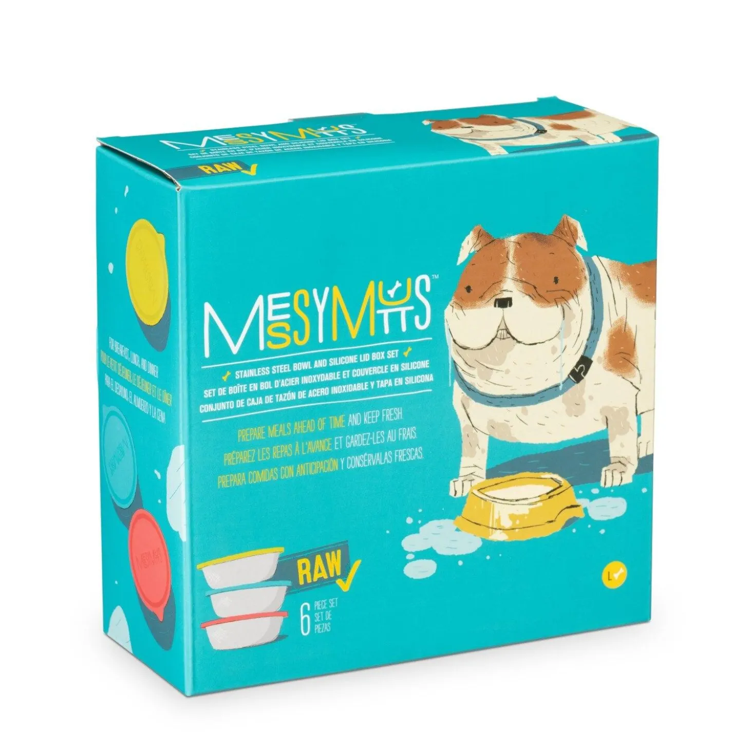 Medium: contains three stainless steel bowls (1.5 cups per bowl) and three silicone lids (approximately 6″ diameter).