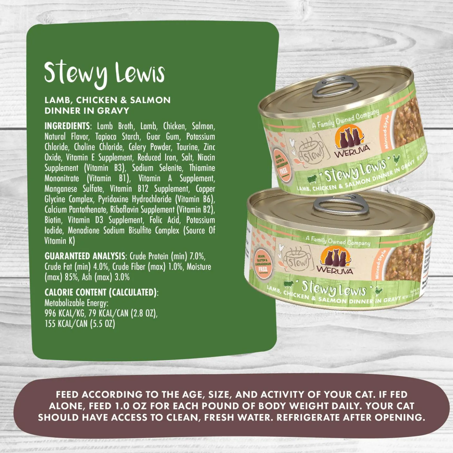 Weruva Stew! Stewy Lewis Lamb, Chicken & Salmon Dinner Cat Food gives the power of love to your kitty again and again with them wanting to devour this delicious dinner. The Stewy Lewis is filled with protein -packed pieces of lamb, chicken and salmon in a delectable gravy. After lapping up this meal, your cat is sure to feel hip to be square!
