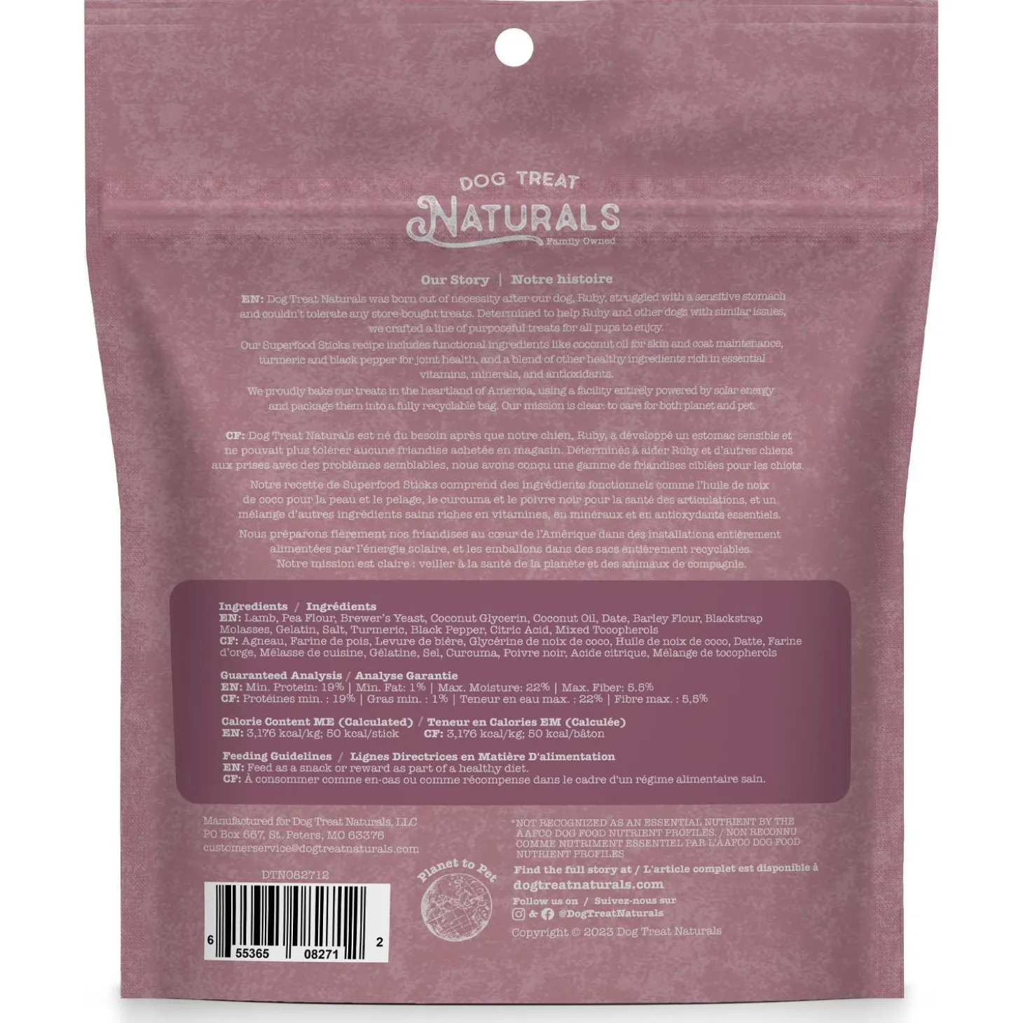 Dog Treat Naturals Superfood Sticks Lamb & Date Dog Treats were born out of necessity for dogs who have sensitive stomachs. Dog Treat Naturals has crafted a line of purposeful treats for all pups to enjoy. This Superfood Sticks recipe includes functional ingredients like coconut oil for skin and coat maintenance, turmeric and black pepper for joint health, and a blend of other healthy ingredients rich in essential vitamins, minerals, and antioxidants. Dog Treat Naturals proudly bakes these treats in the heartland of America, using a facility entirely powered by solar energy and package them into a fully recyclable bag. The mission is clear: to care for both planet and pet.