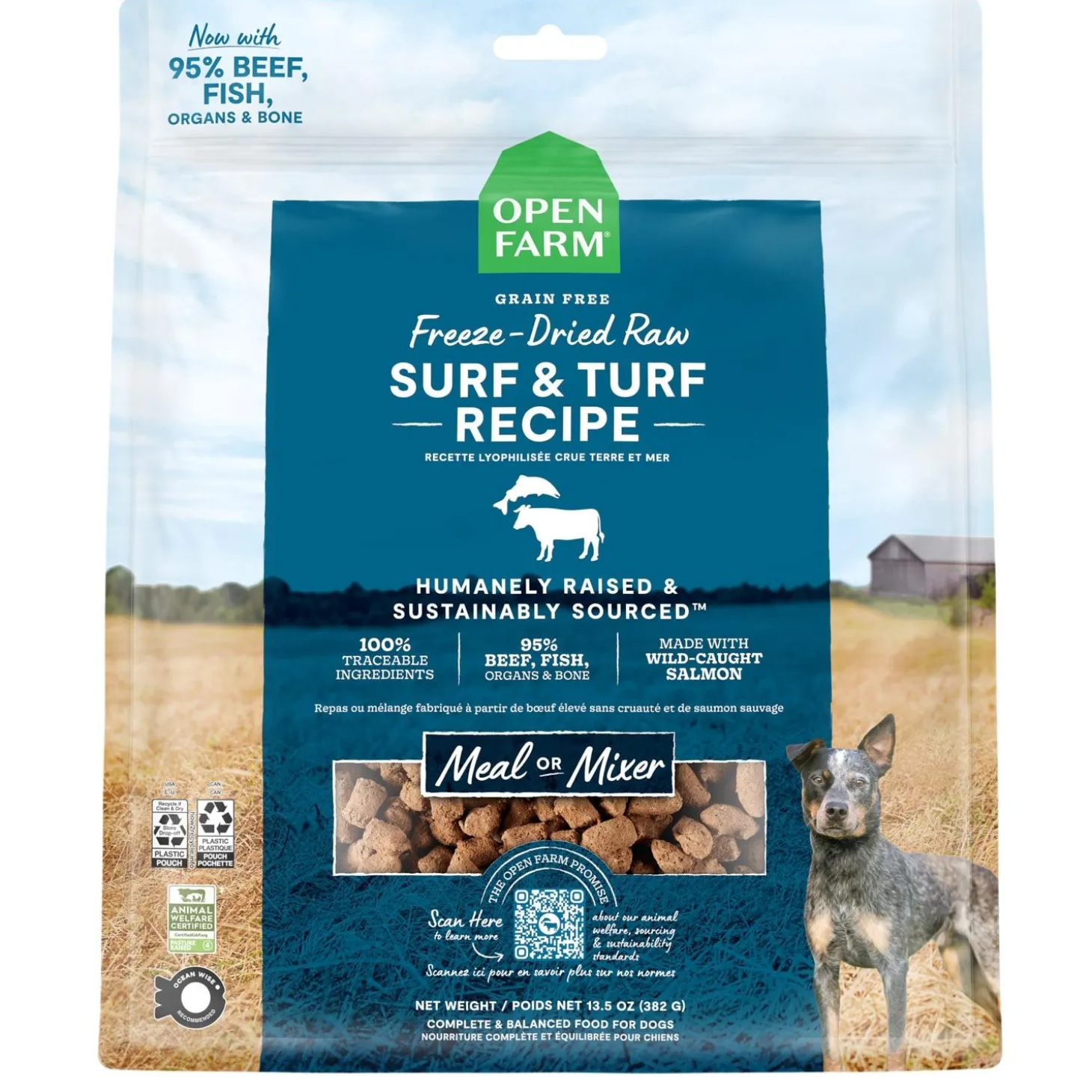 Open Farm Surf & Turf Recipe Freeze Dried Raw Dog Food is easy to serve and hard to resist. This high protein topper or complete meal is packed with humanely raised grass-fed beef and wild-caught Pacific salmon. For added nutrition we include functional ingredients like locally sourced leafy greens, squash and pumpkin seeds, superfoods like coconut oil, and antioxidants like blueberries.