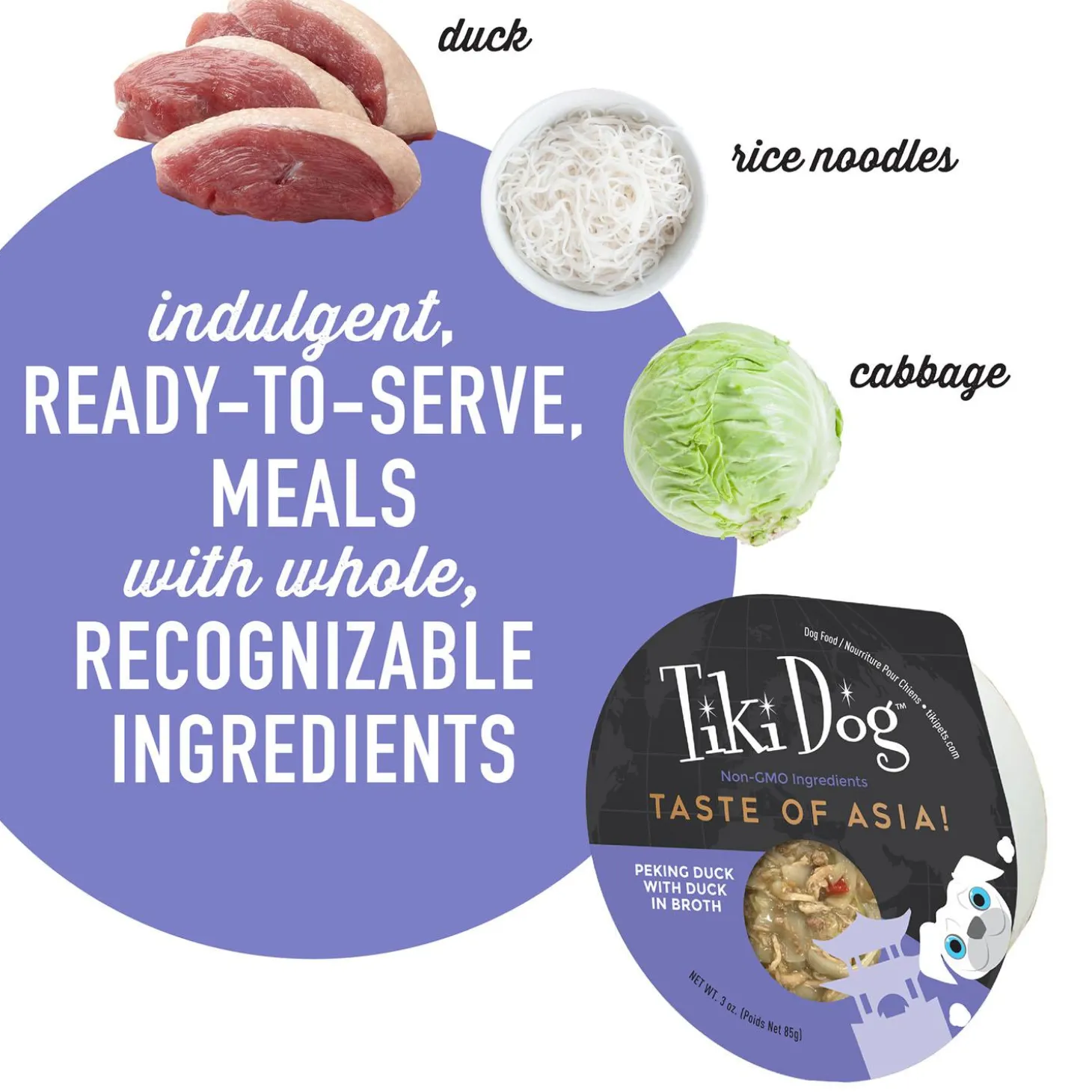 Tiki Dog Taste of the World Asia Peking Duck Recipe in Broth Adult Dog Food will indulge your dog with a taste of international cuisine. These restaurant-inspired meals feature whole, recognizable ingredients. Tiki Dog offers drool-worthy taste in the nutrition that dogs need! Designed with the highest standards in nutrition to keep dogs in optimal health, and you can see it in every bowl.