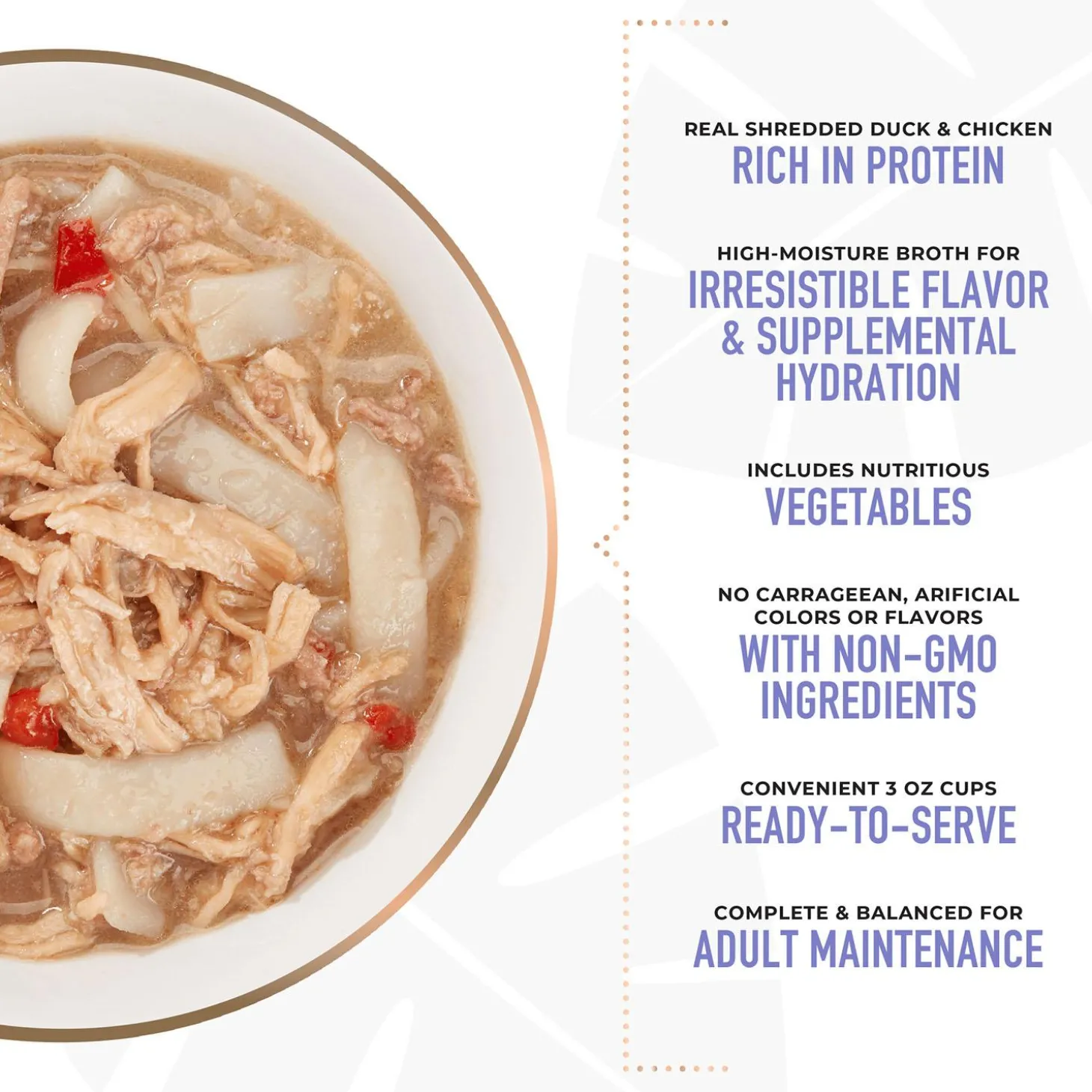 - Whole, Recognizable Ingredients – Only real, non-GMO ingredients like duck, chicken, rice noodles, cabbage, and red bell pepper