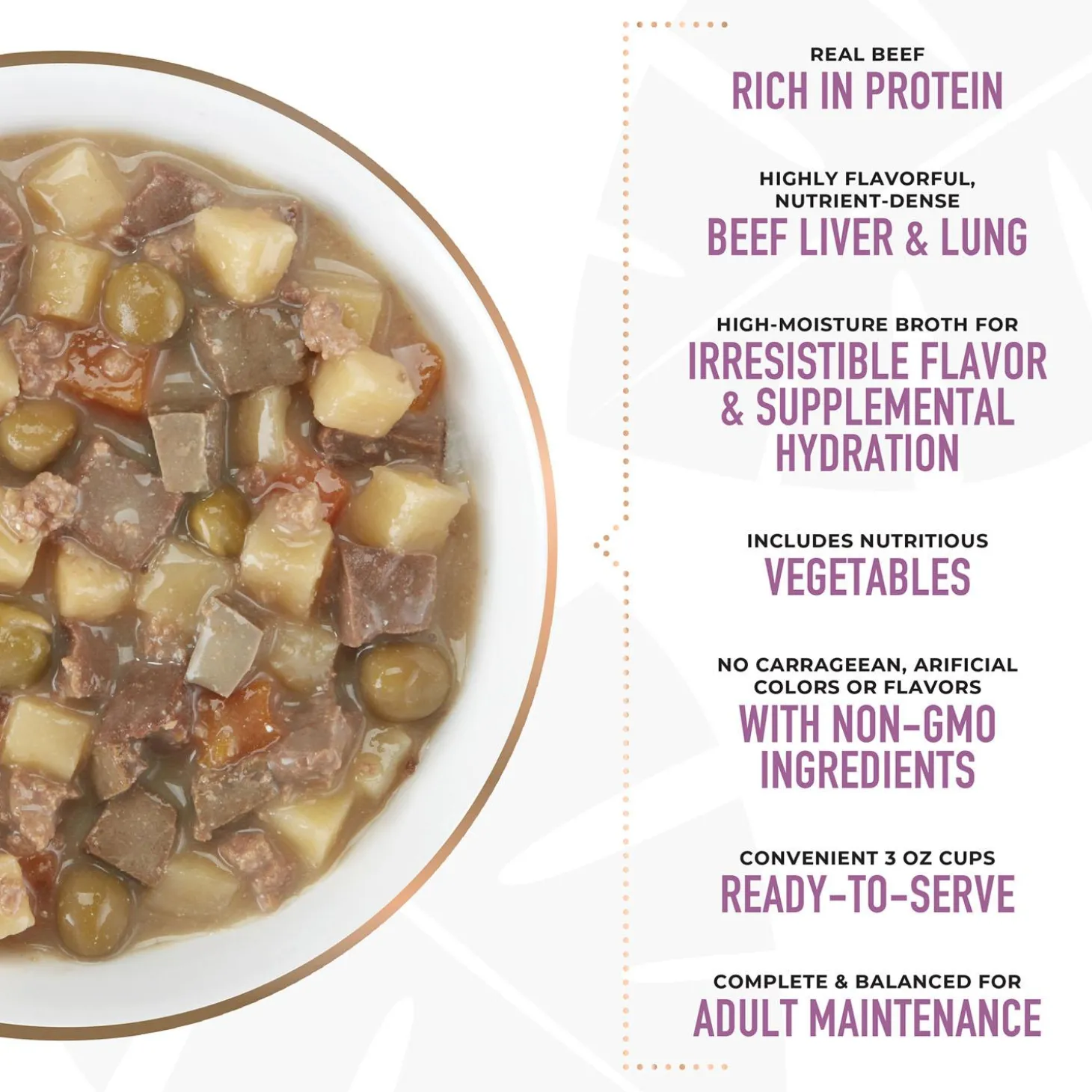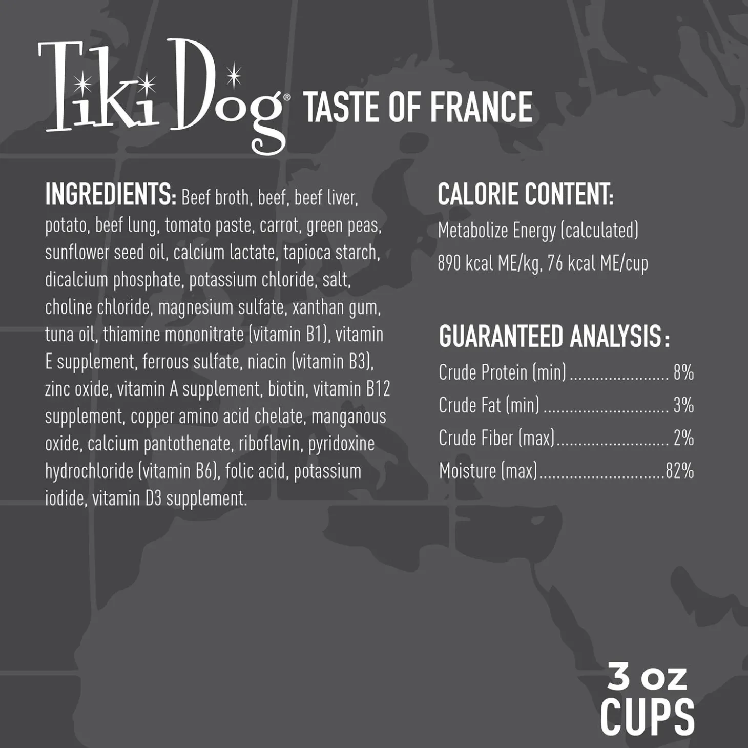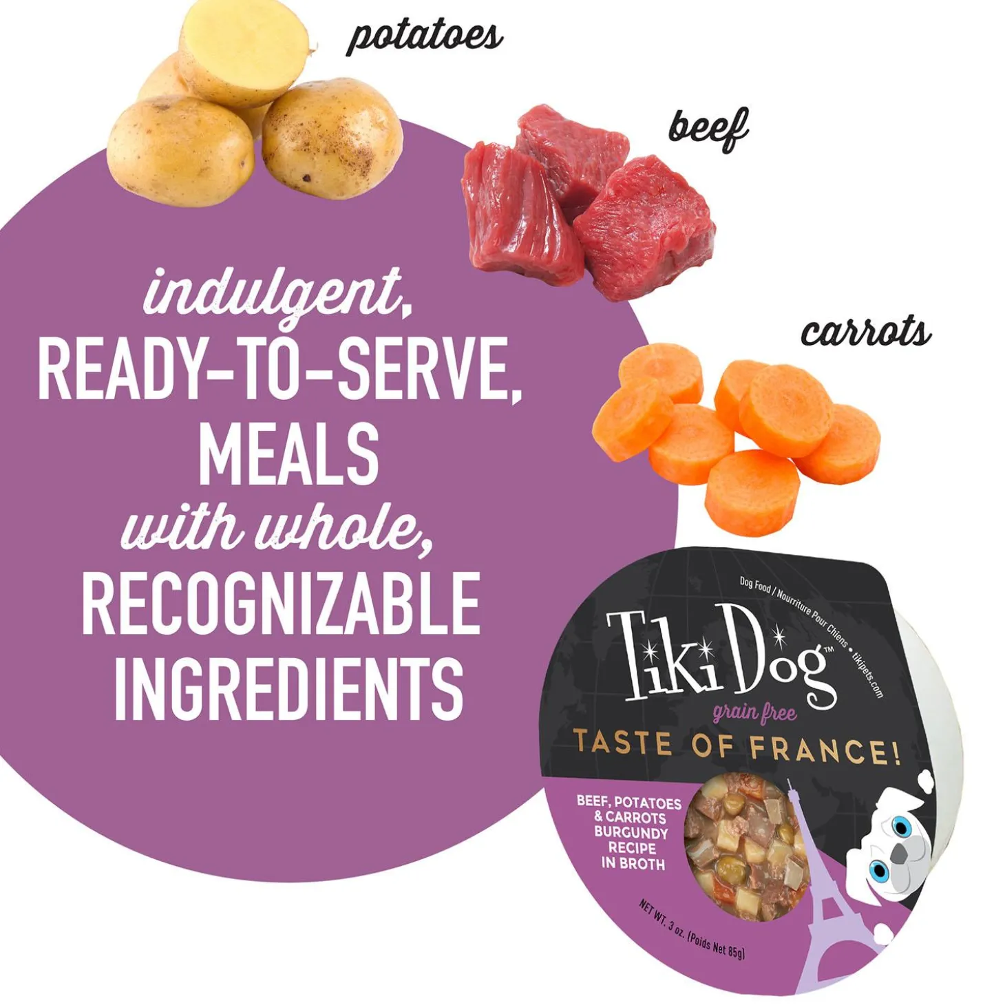 Tiki Dog Taste of the World France Beef, Potatoes & Carrots Burgundy Recipe in Broth Adult Dog Food will indulge your dog with a taste of international cuisine. These restaurant-inspired meals feature whole, recognizable ingredients. Tiki Dog offers drool-worthy taste in the nutrition that dogs need! Designed with the highest standards in nutrition to keep dogs in optimal health, and you can see it in every bowl.