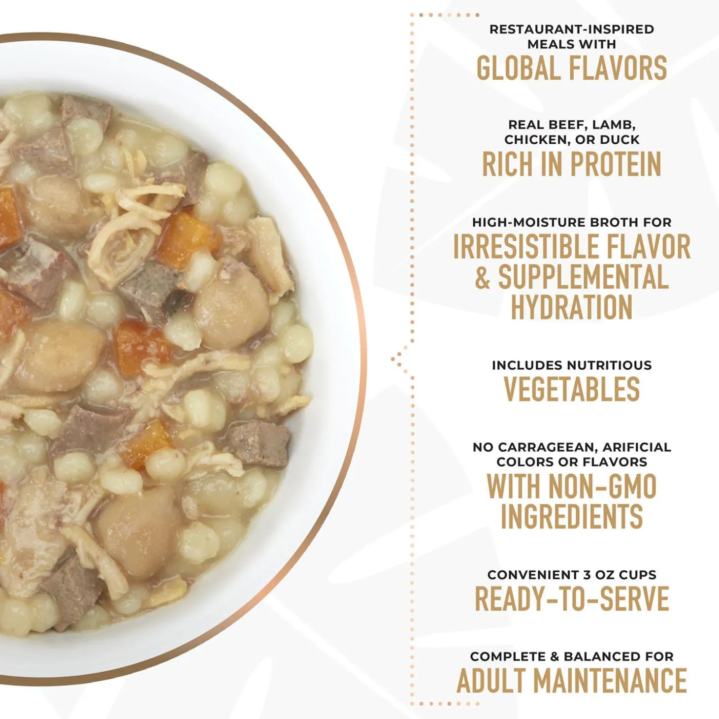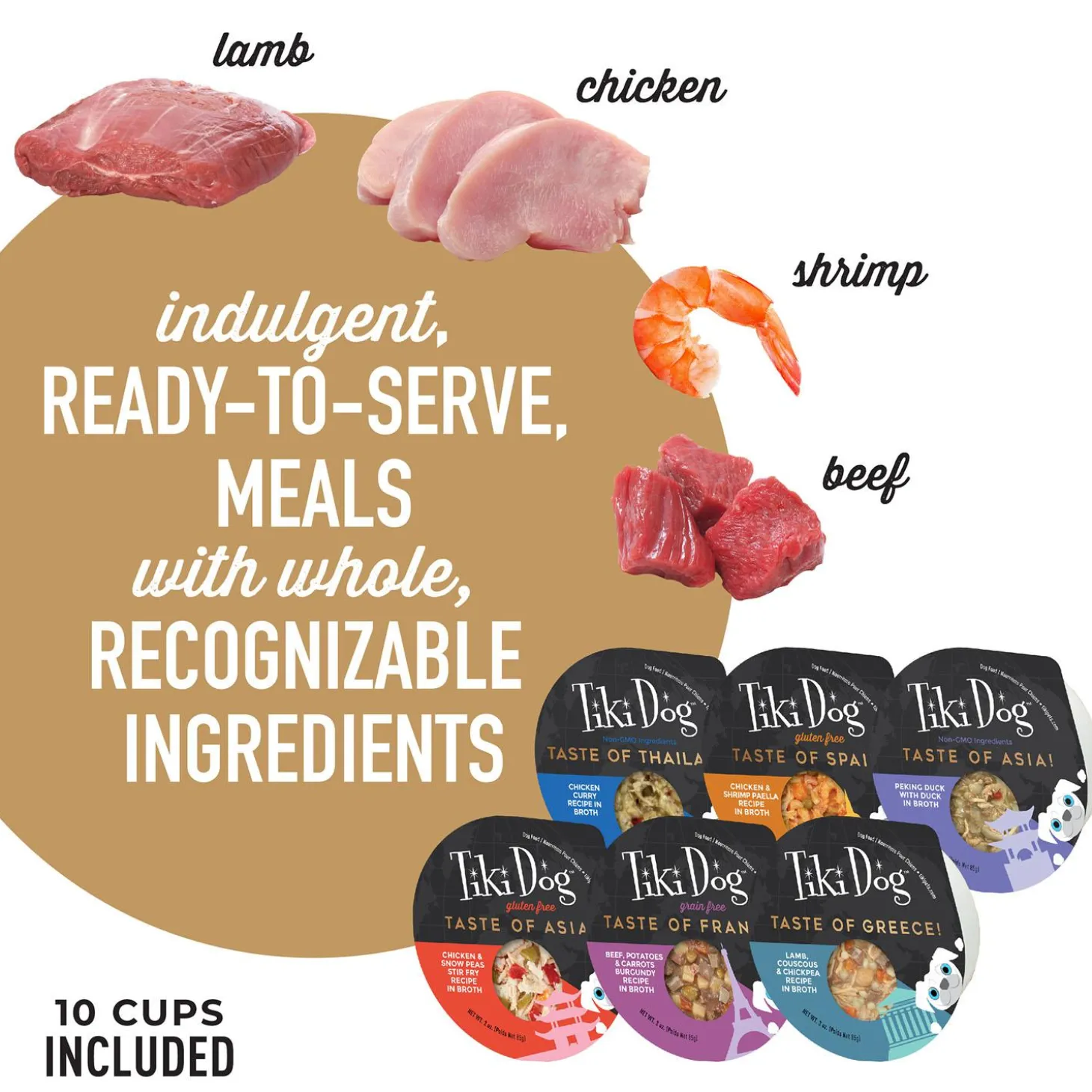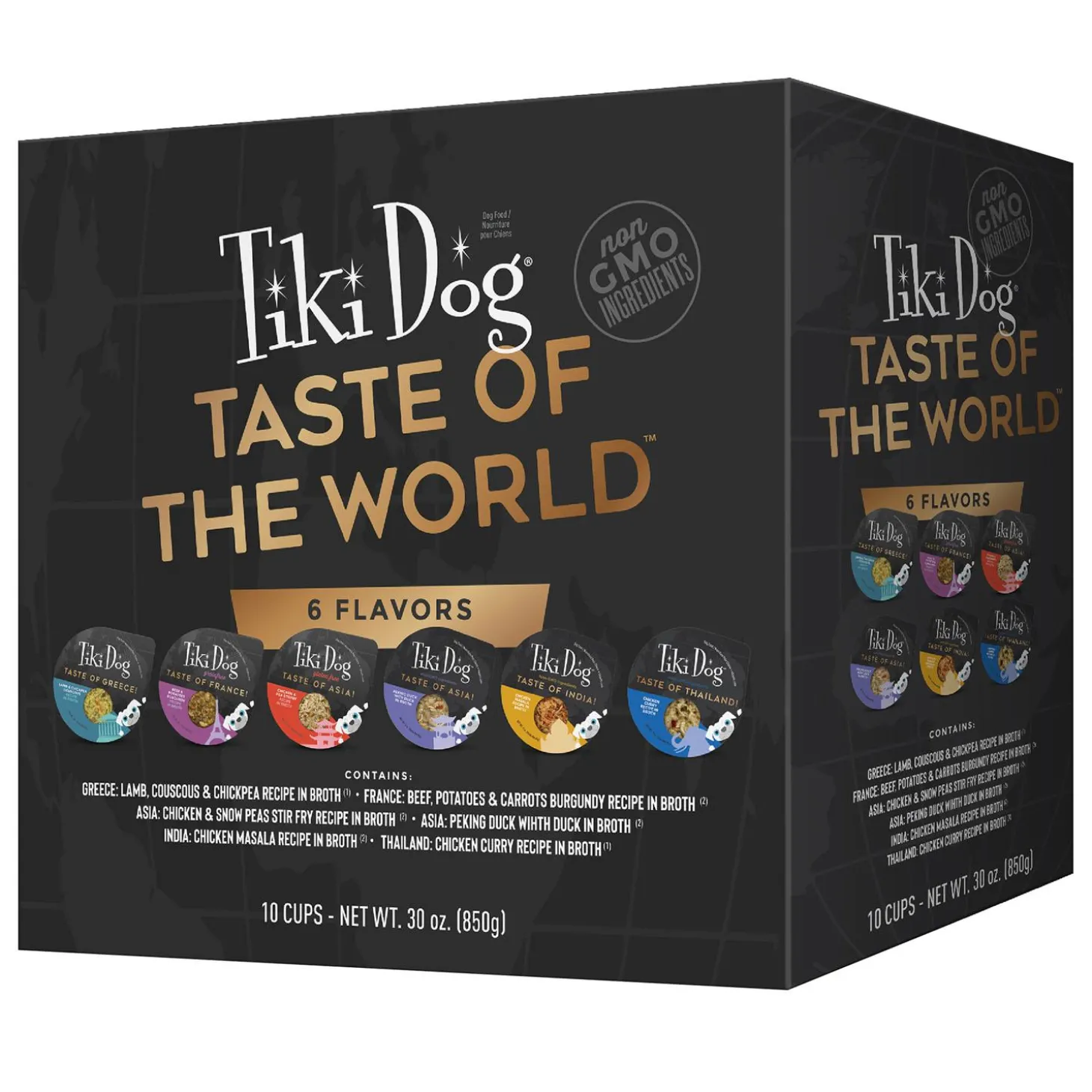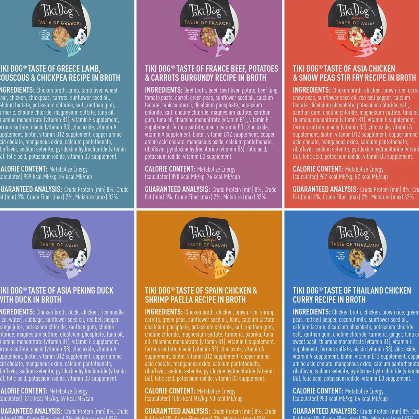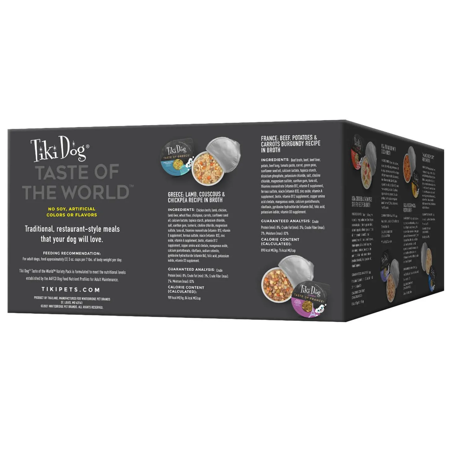 Tiki Dog Taste of the World Variety Pack Adult Dog Food will indulge your dog with a taste of international cuisine. These restaurant-inspired meals feature whole, recognizable ingredients. Tiki Dog offers drool-worthy taste in the nutrition that dogs need! Designed with the highest standards in nutrition to keep dogs in optimal health, and you can see it in every bowl.