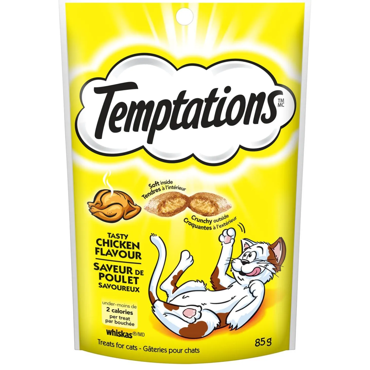Temptations Tasty Chicken Flavour Cat Treats have less than 2 calories per treat and provide an irresistible combination of both crunchy and soft textures. These cat treats are a perfect addition to your cat’s normal feeding routine. Cats can’t resist the delectable taste of Temptations, so give your cat these purrfect cat treats… they’ll come running the moment you open the pack!