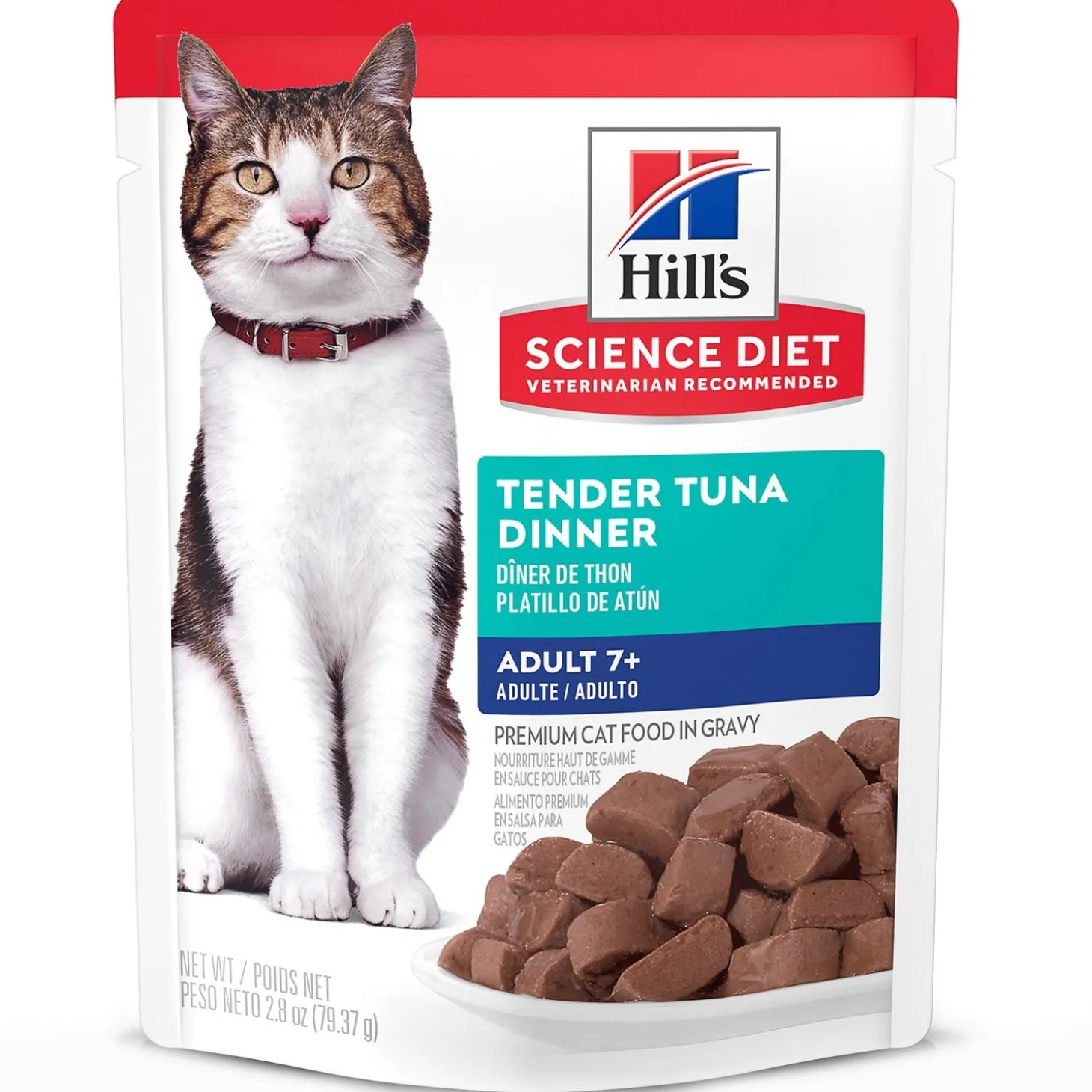 Hill’s Science Diet Tender Tuna Dinner in Gravy Adult 7+ Cat Food comes in a pouch that’s easy to open and easy to feed. With delicious chunks in a decadent gravy, even the most picky eaters will love this soft and tender cat food. Made in the USA with global ingredients you can trust, it includes clinically proven antioxidants to support a healthy immune system for cats age 7+. Cater to your senior cat’s refined palate with a taste more sophisticated than kitten food, and serve this gourmet daily nutrition as a balanced meal by itself or try it on top of Hills Science Diet Adult dry kibble.