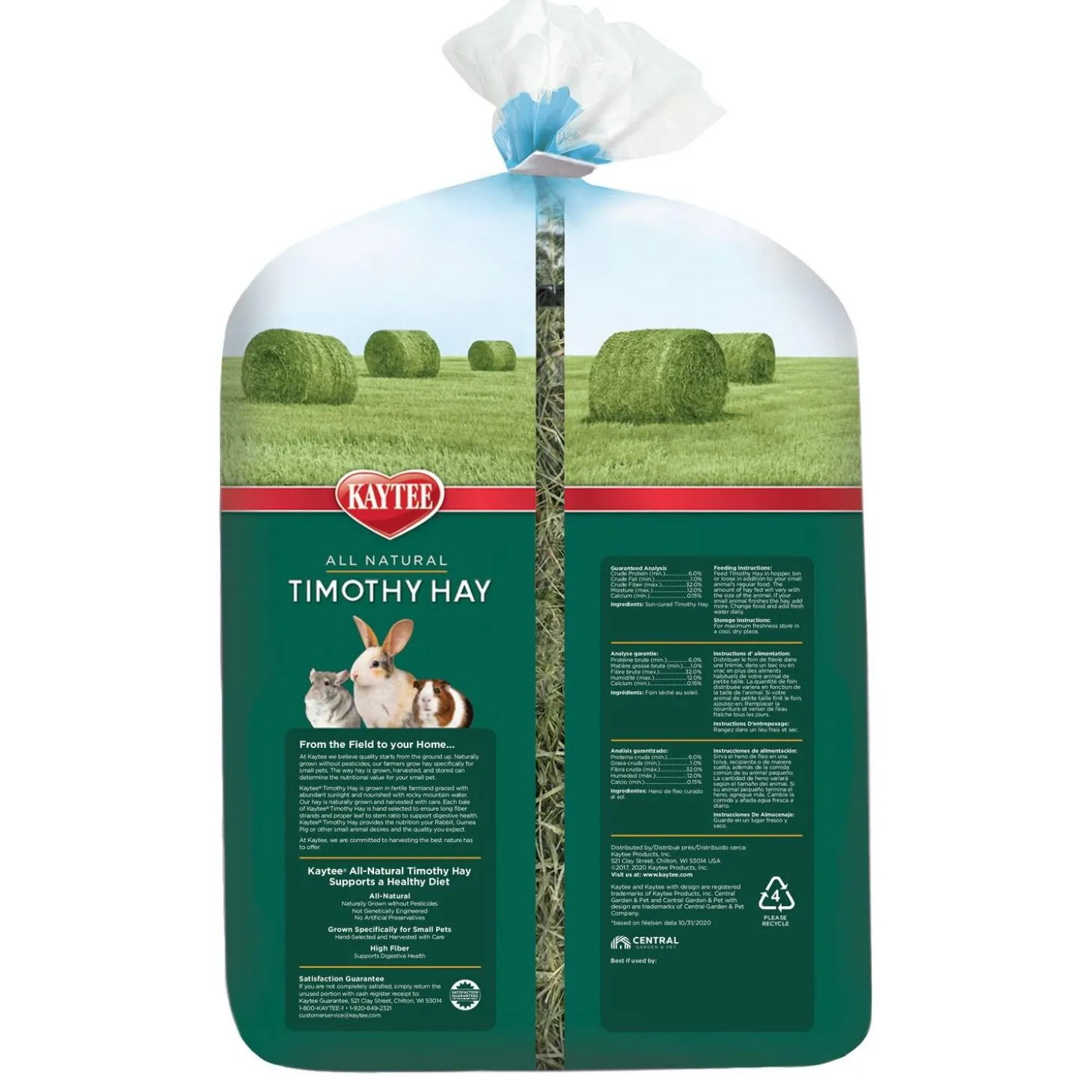 Kaytee Timothy Hay for Small Animals is hand selected to ensure the long fiber strands and proper leaf to stem ratio to support digestive health. Kaytee Timothy Hay is grown in the ideal ecological location for moisture and climate control and is then stored in a protected environment to ensure the quality and superior nutritional value are maintained. Timothy Hay is ideal for animals over 7 months of age because it is higher in fiber to support digestive health and lower in protein and calcium than alfalfa hay to support urinary health.