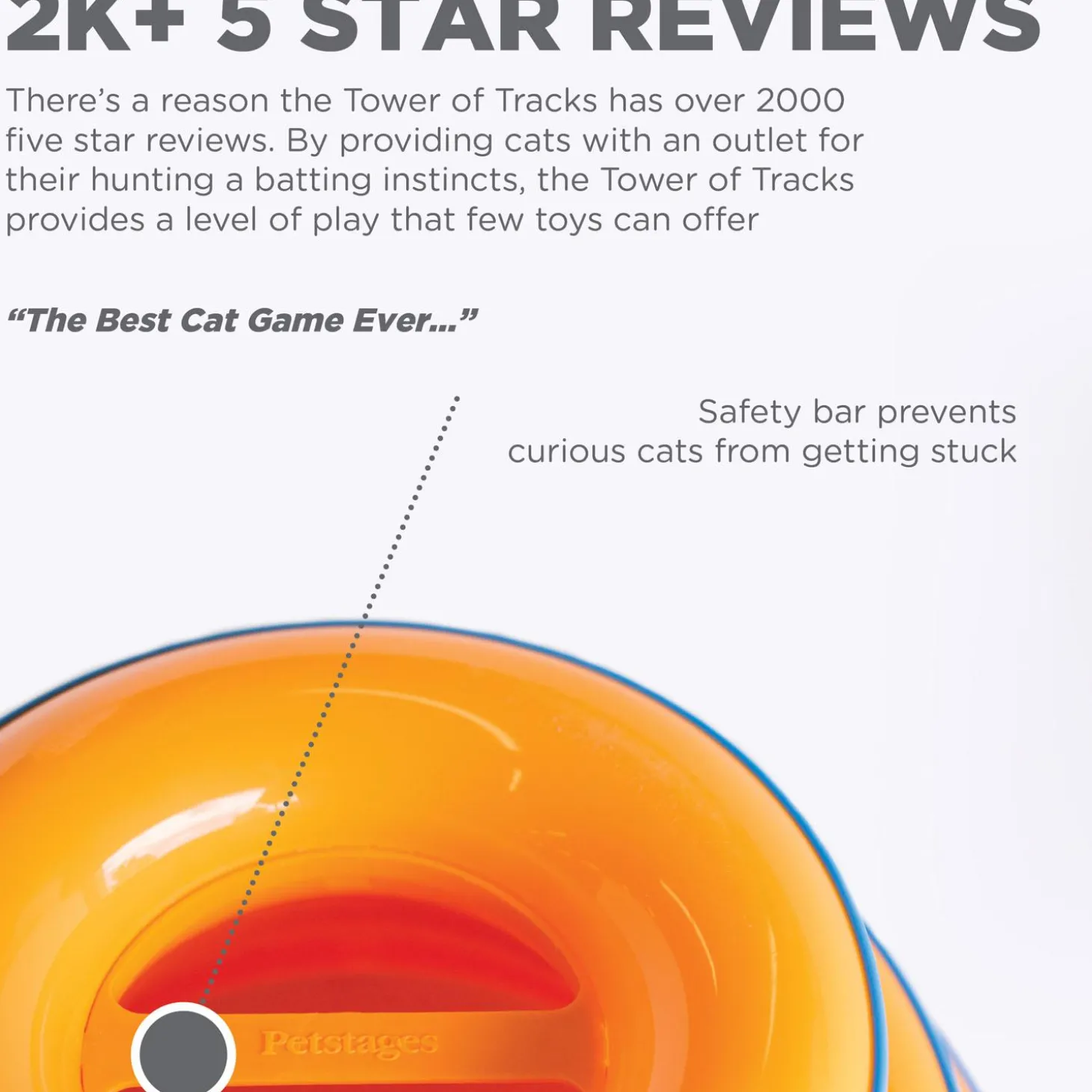 Catstages Tower of Tracks Orange Cat Toy is sure to have your kitty chasing, swatting, batting and catching the bright-coloured balls as they race around the track! The Catstages Tower of Tracks has three levels and six balls that spin and roll as your kitty plays. The non-slip base and sturdy construction make it ideal for vigorous play of households with one or more cats.