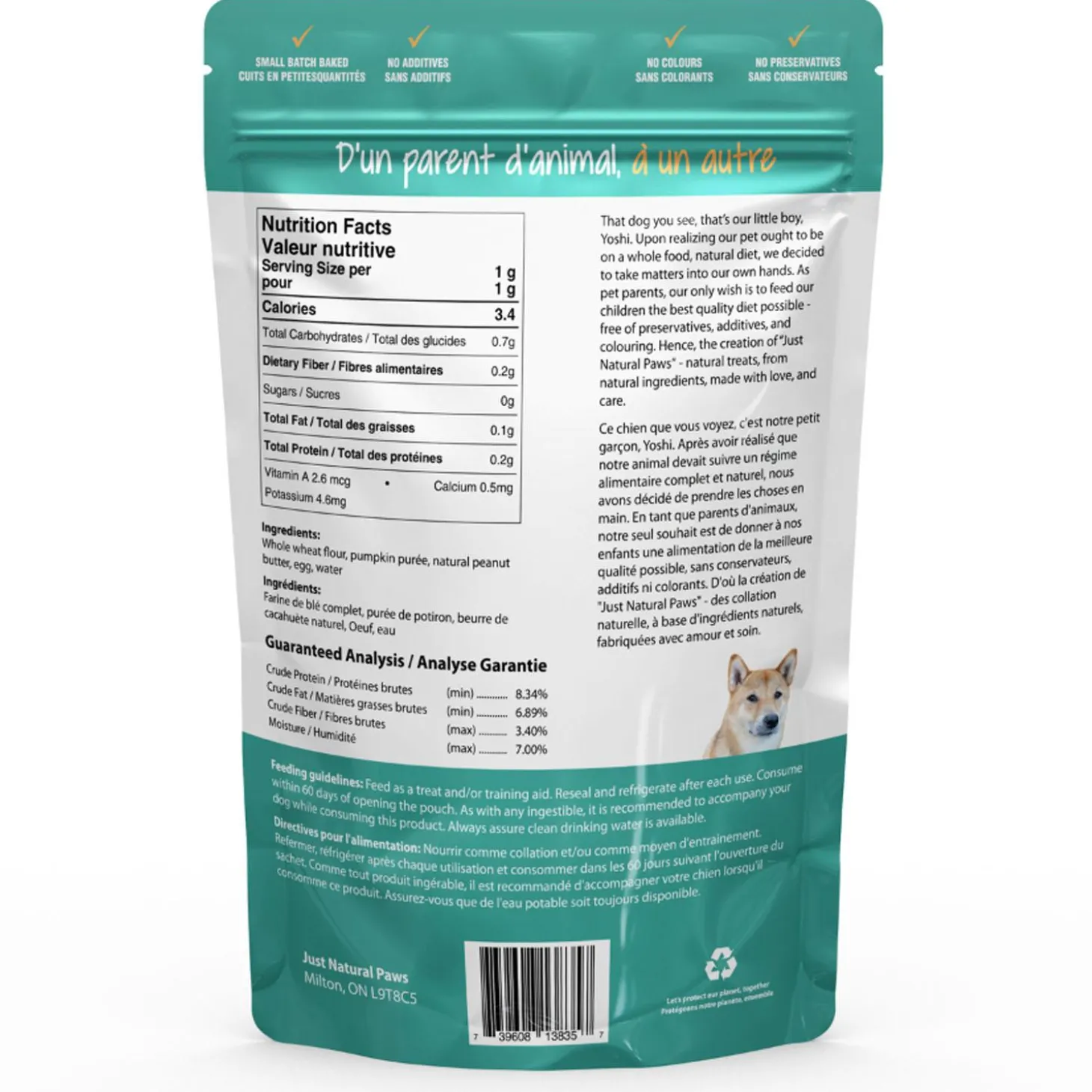 Just Natural Paws Trainers Peanut Butter & Pumpkin Dog Treats will nourish your loved one with wholesome ingredients and superfood ingredients. Created with a perfect blend of all around nutrition supporting your dog’s health, it is a best of both worlds for our furry friends and us caretakers – they love the taste, and we love the nutrition.