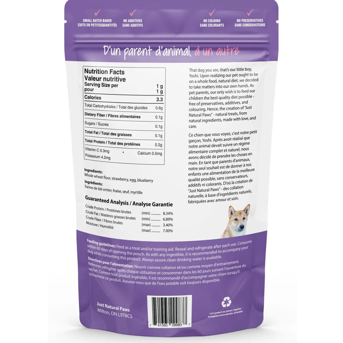 Just Natural Paws Trainers Strawberry & Blueberry Dog Treats will nourish your loved one with wholesome ingredients and superfood ingredients. Created with a perfect blend of all around nutrition supporting your dog’s health, it is a best of both worlds for our furry friends and us caretakers – they love the taste, and everyone loves the nutrition.