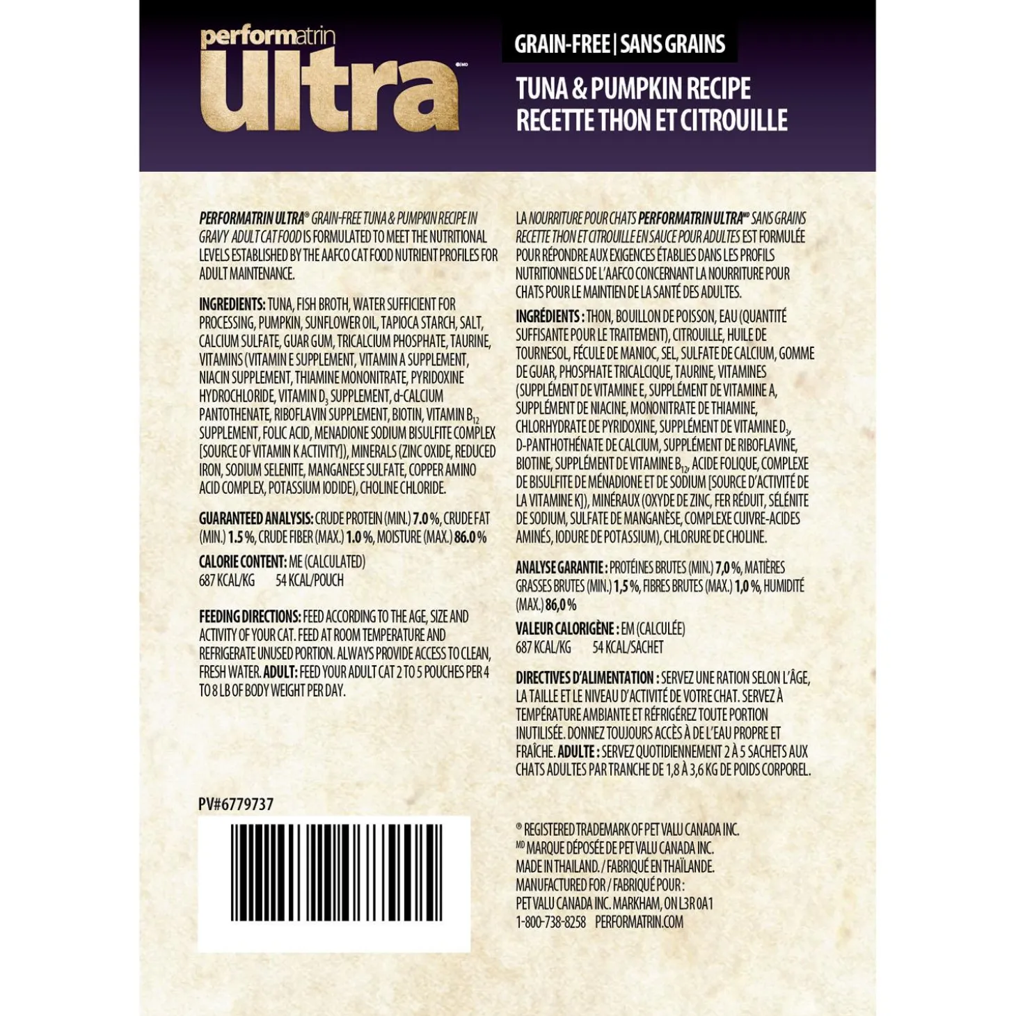 Performatrin Ultra Tuna & Pumpkin Recipe in Gravy Adult Cat Food is a complete and balanced food for your cat. This delicious recipe combines real tuna and pumpkin in a savory gravy, enhancing your cat’s diet with wholesome ingredients and rich flavours. Ideal for daily feeding, it is free from carrageenan, grains, gluten, corn, soy, artificial flavours, colours and is packed in BPA free pouches, ensuring only the best for your beloved cat. Serve it as an everyday food to show your love and care for your feline companion.