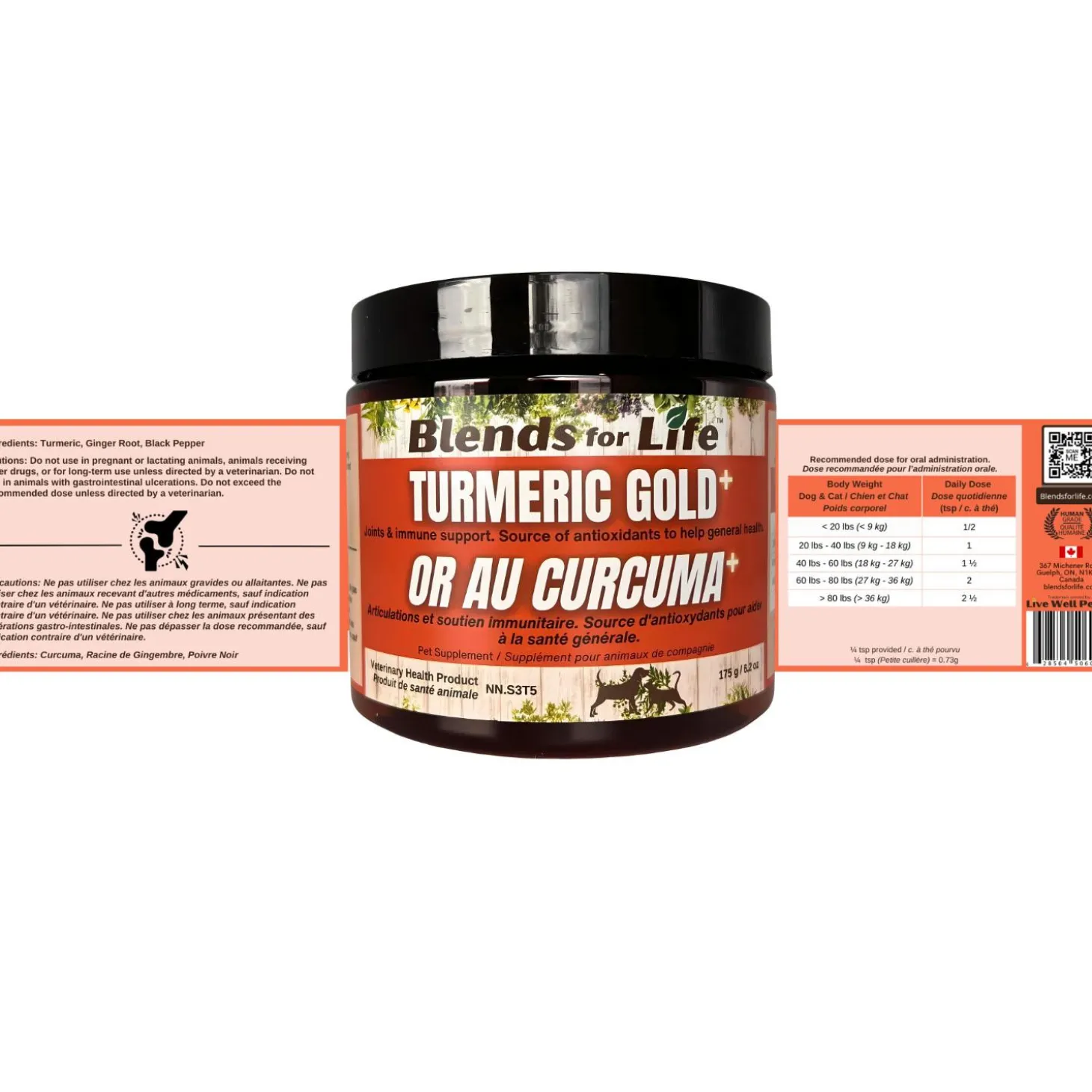 Blends for Life Turmeric Gold+ Joints & Immune Support Pet Supplement may help with anti-inflammatory, pain and arthritis, and heart and liver function. Turmeric is also a good way to help maintain normal joint health. Organic Turmeric contains curcumin, a compound known for its anti-inflammatory properties and may help with pain. Organic Black pepper contains piperine, which can enhance the absorption and bioavailability of other nutrients and compounds. When combined with turmeric, black pepper can help increase the absorption of curcumin in pets, maximizing its benefits. Organic Ginger also possesses anti-inflammatory properties and can help soothe the digestive system. These natural superfoods can help manage joint pain, arthritis, and inflammation in dogs and cats. It is packaged it in a recyclable jar with a small scoop for easy serving.