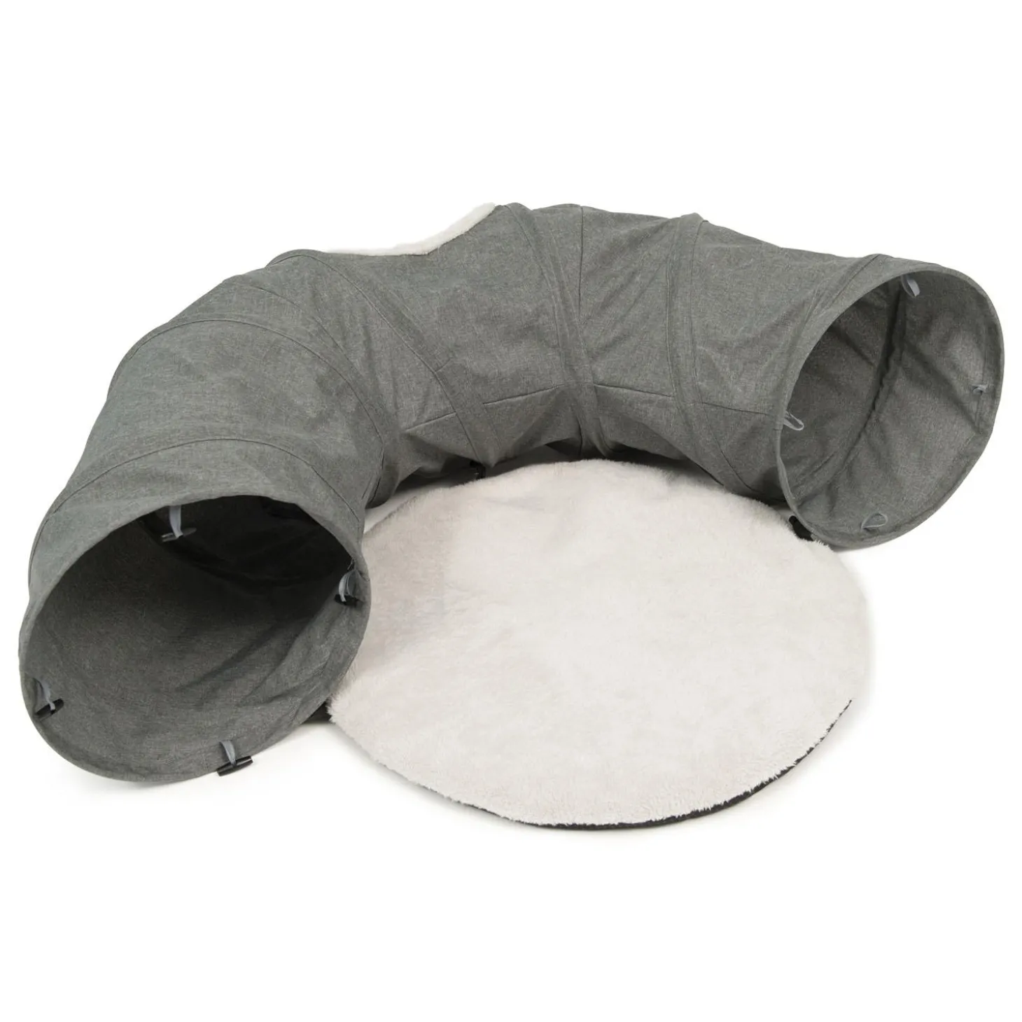 Catit Vesper Grey Tunnel is an exceptionally stylish, open-ended cat play tunnel. It has a little peek-a-boo opening in the middle with a plush ball toy hanging on a string. This spot is perfect for cats to observe their surroundings through. If your cat needs some downtime after play, they can unwind on the round padded cushion.