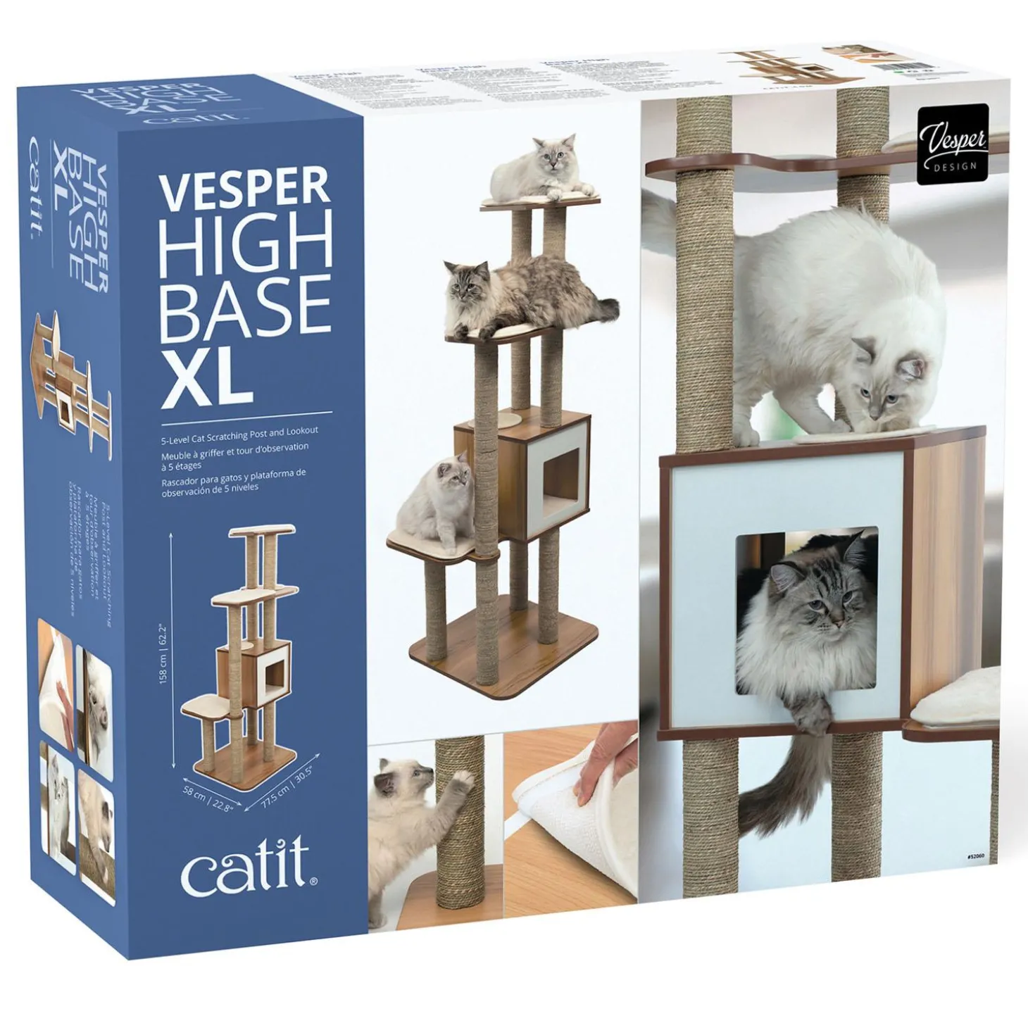 Catit Vesper High Base XL Walnut Cat Tree is a high-rise cat scratching post and lookout with five levels. With its five levels, the Vesper High Base XL is the ideal cat tree for cats who love to perch up high and arch their backs to the fullest while scratching. Great for multiple cats or larger cat breeds!
