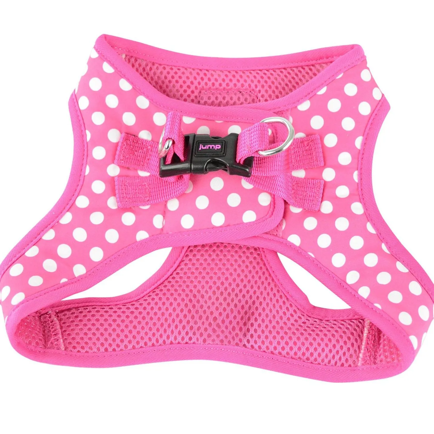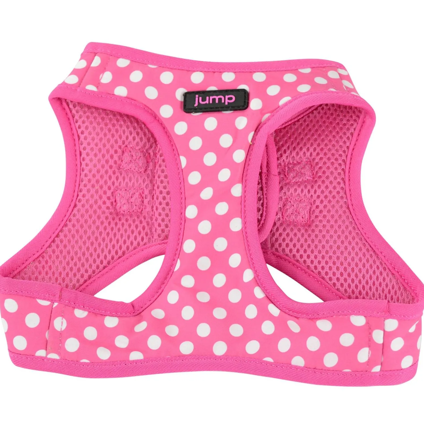 Jump Vest Pink Polka Dot Dog Harness allows your pup to be comfortable and stylish. Made with breathable air-mesh fabric in fun patterns and colours. This vest is designed to be put on and taken off easily and the adjustable fit will keep your pet comfortable and secure.