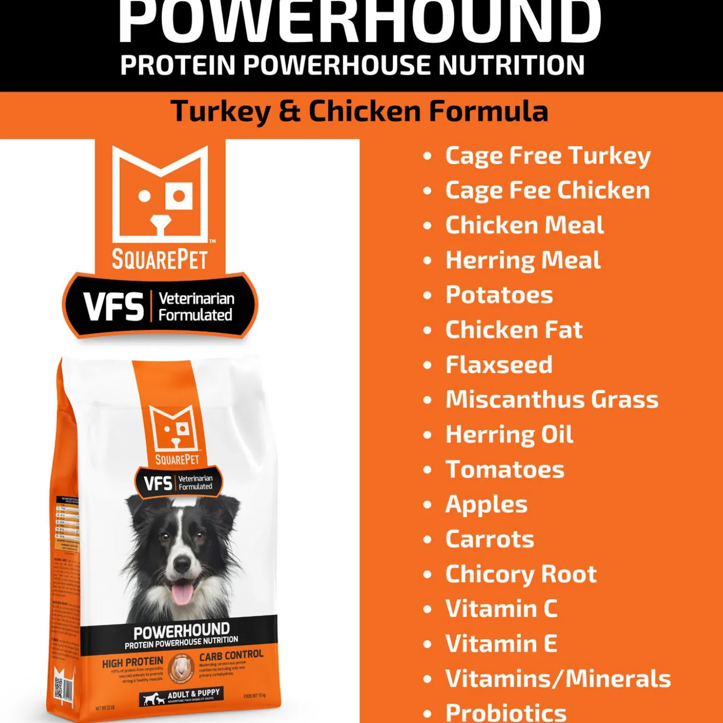 SquarePet VFS POWERHOUND Cage Free Turkey & Chicken Dog Food is energy dense, high protein canine nutrition with guaranteed ultra-low carbohydrates specifically formulated by veterinarians for canines. The high meat-based protein nutrition found in VFS POWERHOUND supports energy demands, strong muscles and bones, and promotes lean body mass for optimum body condition and weight control. VFS POWERHOUND is ideal for all life stages, including growing puppies and pregnant and lactating females.