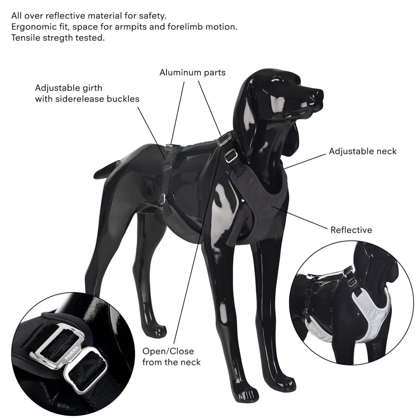 - Strong aluminum buckle on the neck strap allows you to open the neck part too for dogs who don’t like putting harnesses over their head
