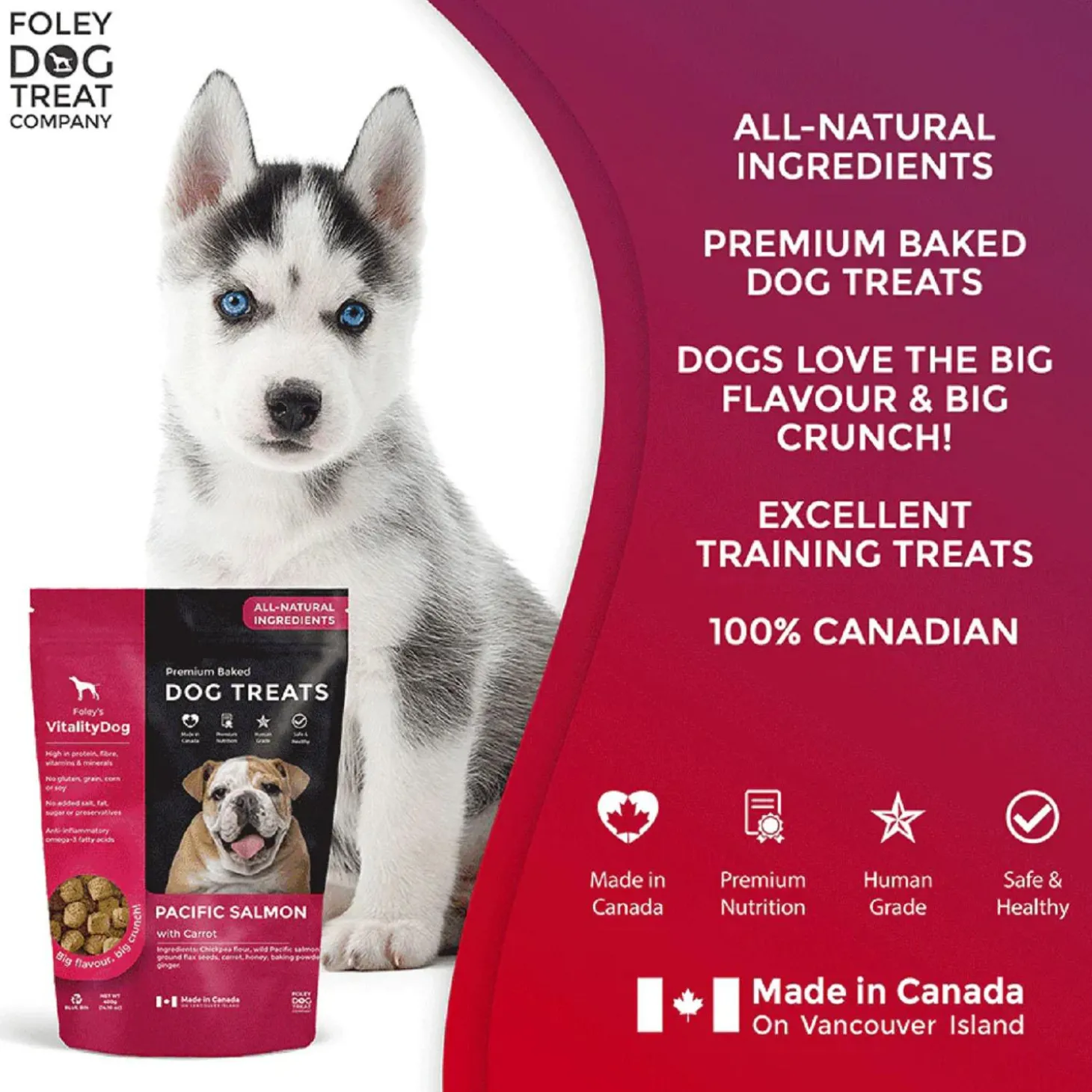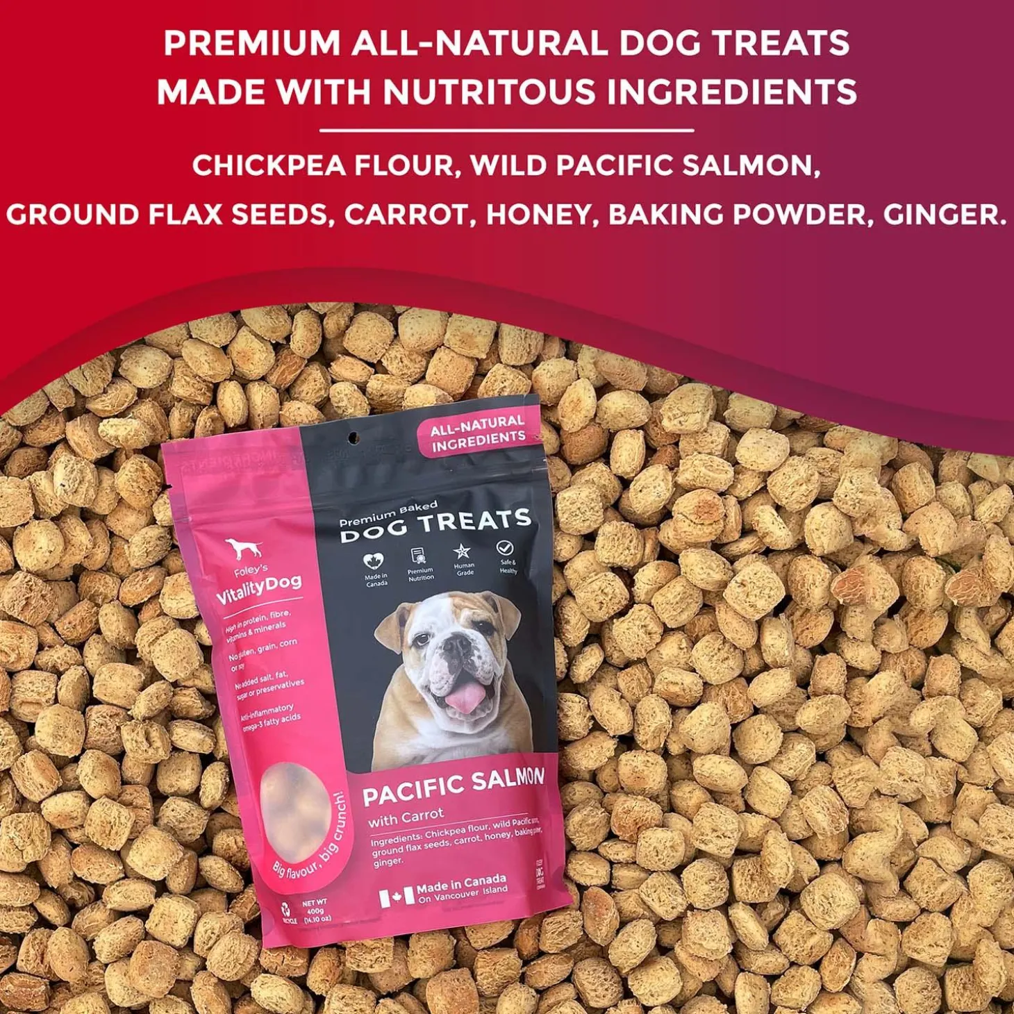 Foley VitalityDog Pacific Salmon with Carrots Dog Treats contain Wild, Pacific salmon that is high in omega-3 fatty acids, which support the immune system and decreases inflammation. Carrots are an excellent source of vitamin A, potassium, and fiber. The new standard in premium baked dog treats.