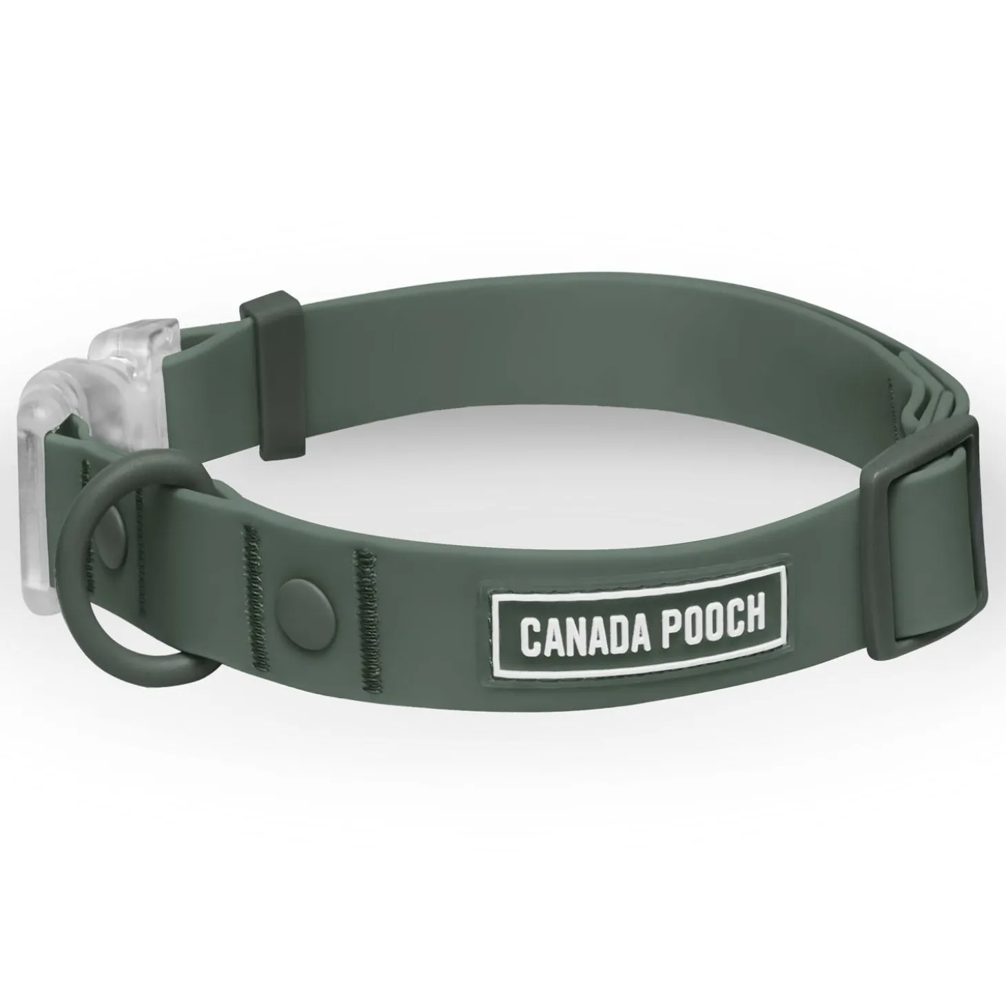 Canada Pooch Waterproof Forest Green Dog Collar is an odour-resistant and waterproof dog collar for any adventure. Can be used in rain or shine, on land or in water. Made with extra strength PVC coated wedding making it easy to clean!