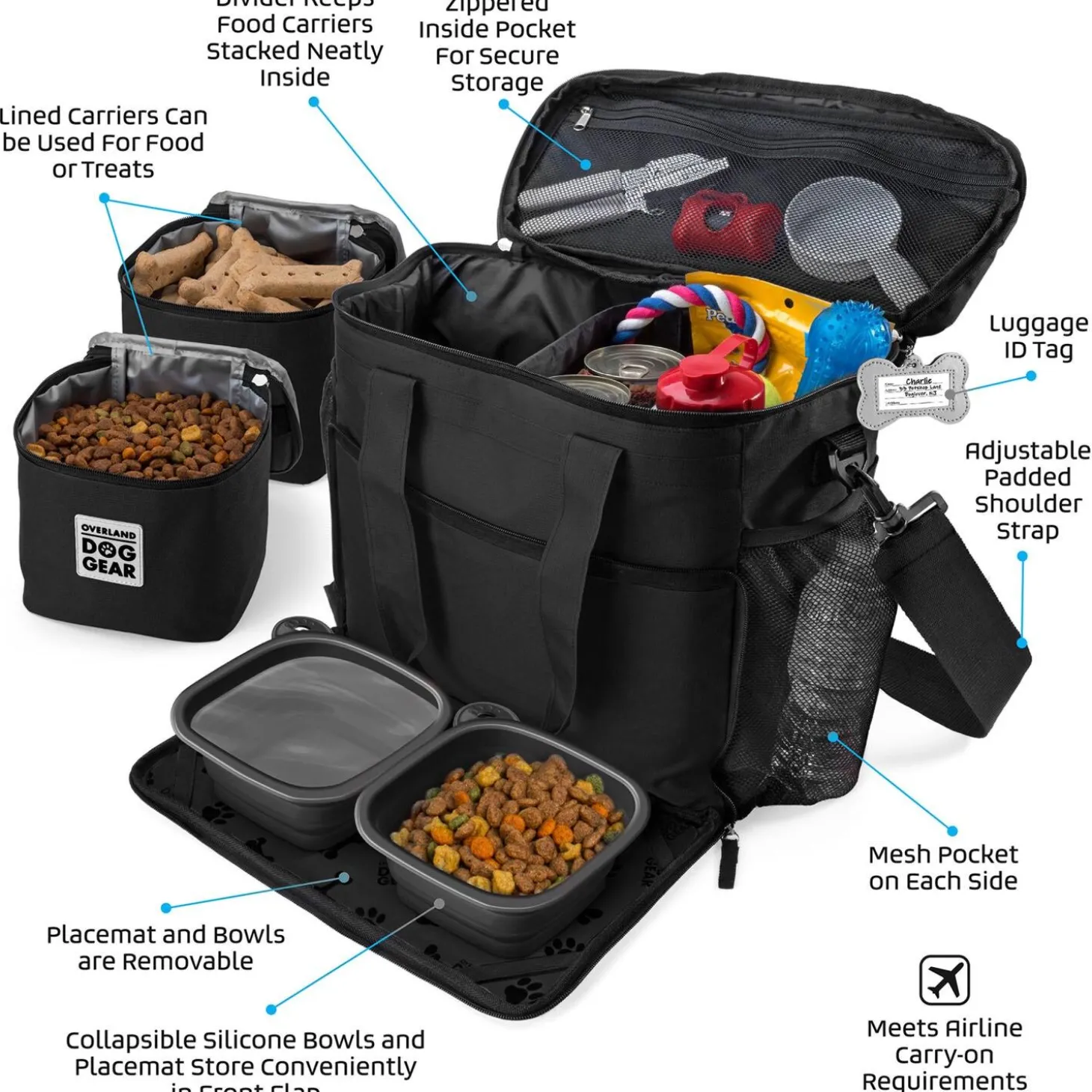 Mobile Dog Gear Week Away Black Travel Bag is the perfect size for packing your pets belongings for up to a week away. Included with your bag are two 15-cup lined food/treat carriers, two 5-cup collapsible silicone bowls and a non-stick placemat that store conveniently in the front flap.
